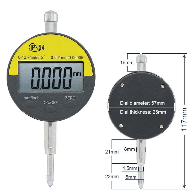Dial Diameter: 57 mm Measuring Range: 0-12.7 mm Accuracy: 0.01mm/0.001 mm Dial Thickne: 16 mm Batteries Needed: RS232 (Included)