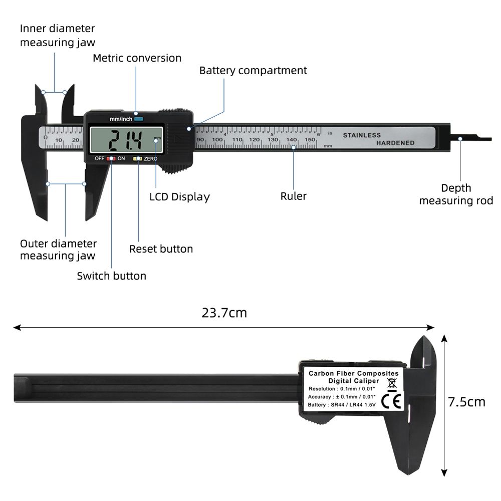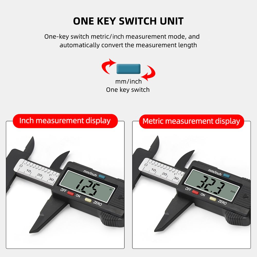 With 0-150mm measuring range and 0.1mm high accuracy; one button easy to switch between mm and inch.