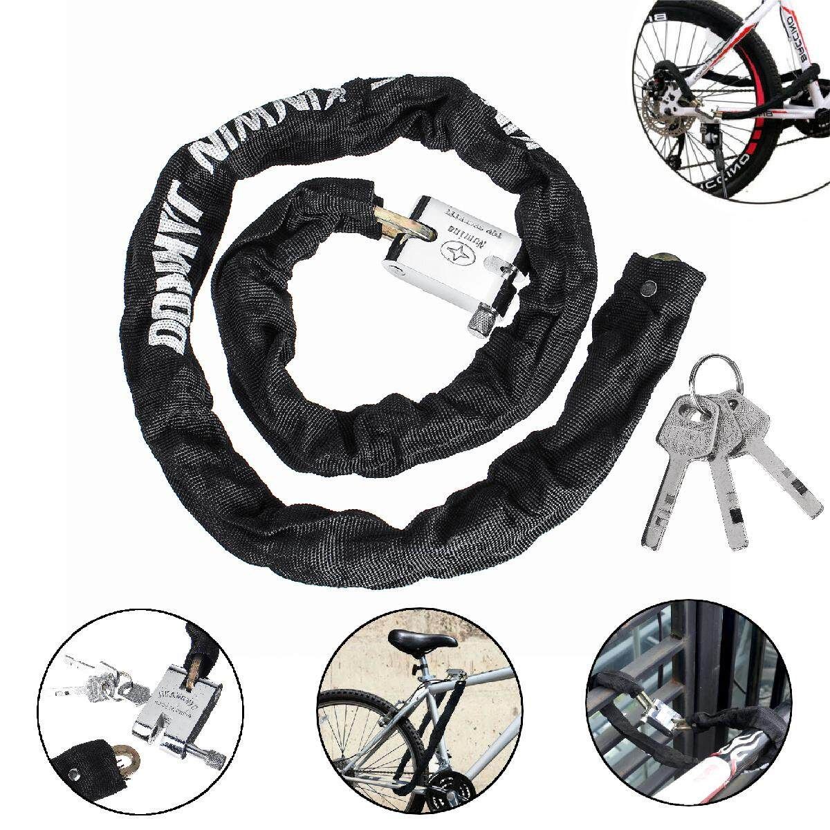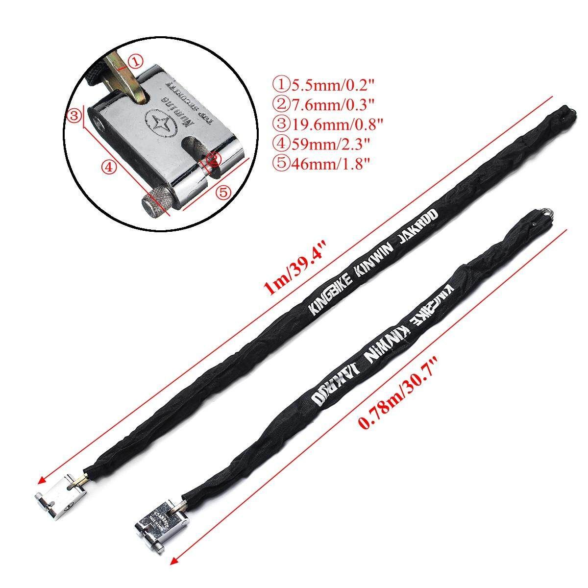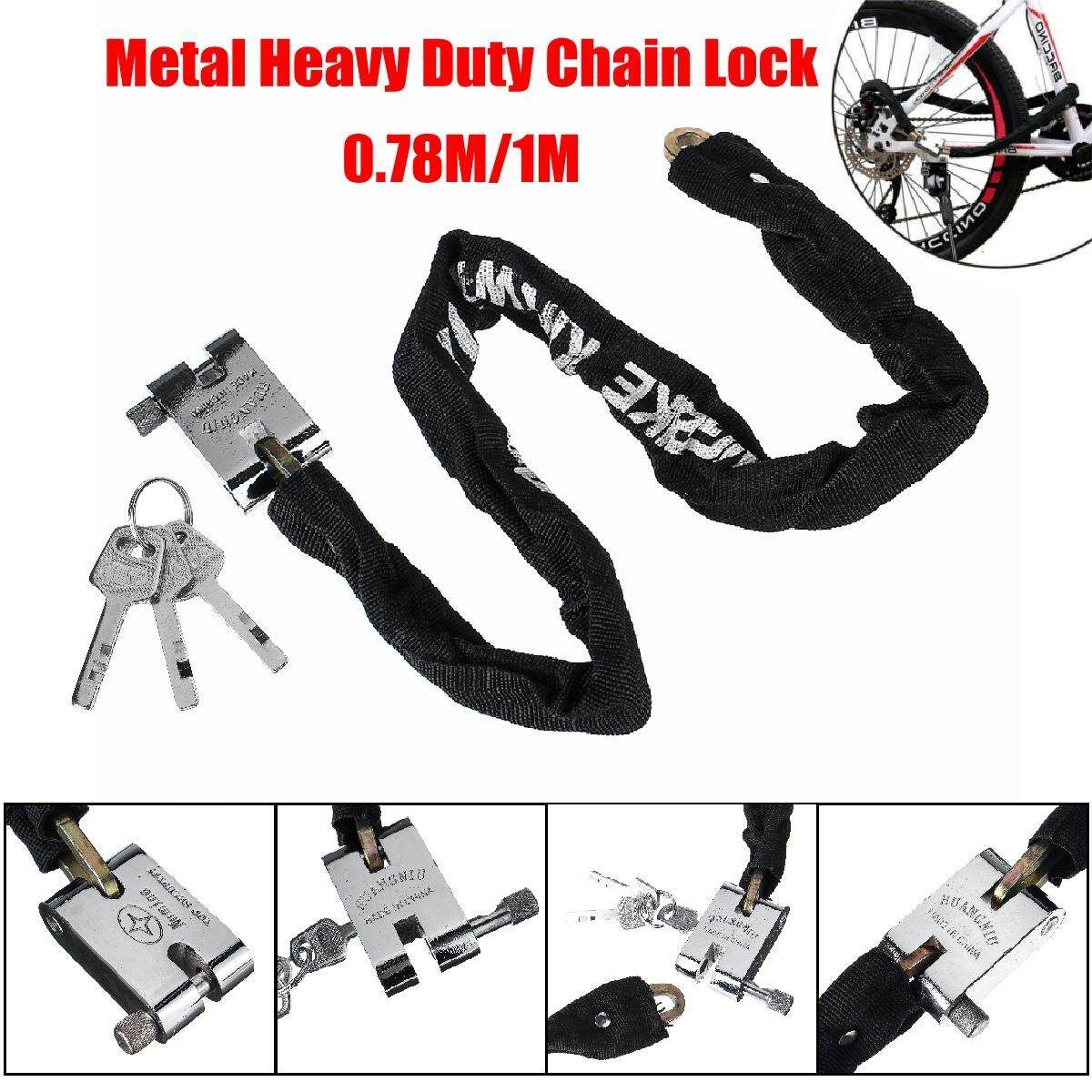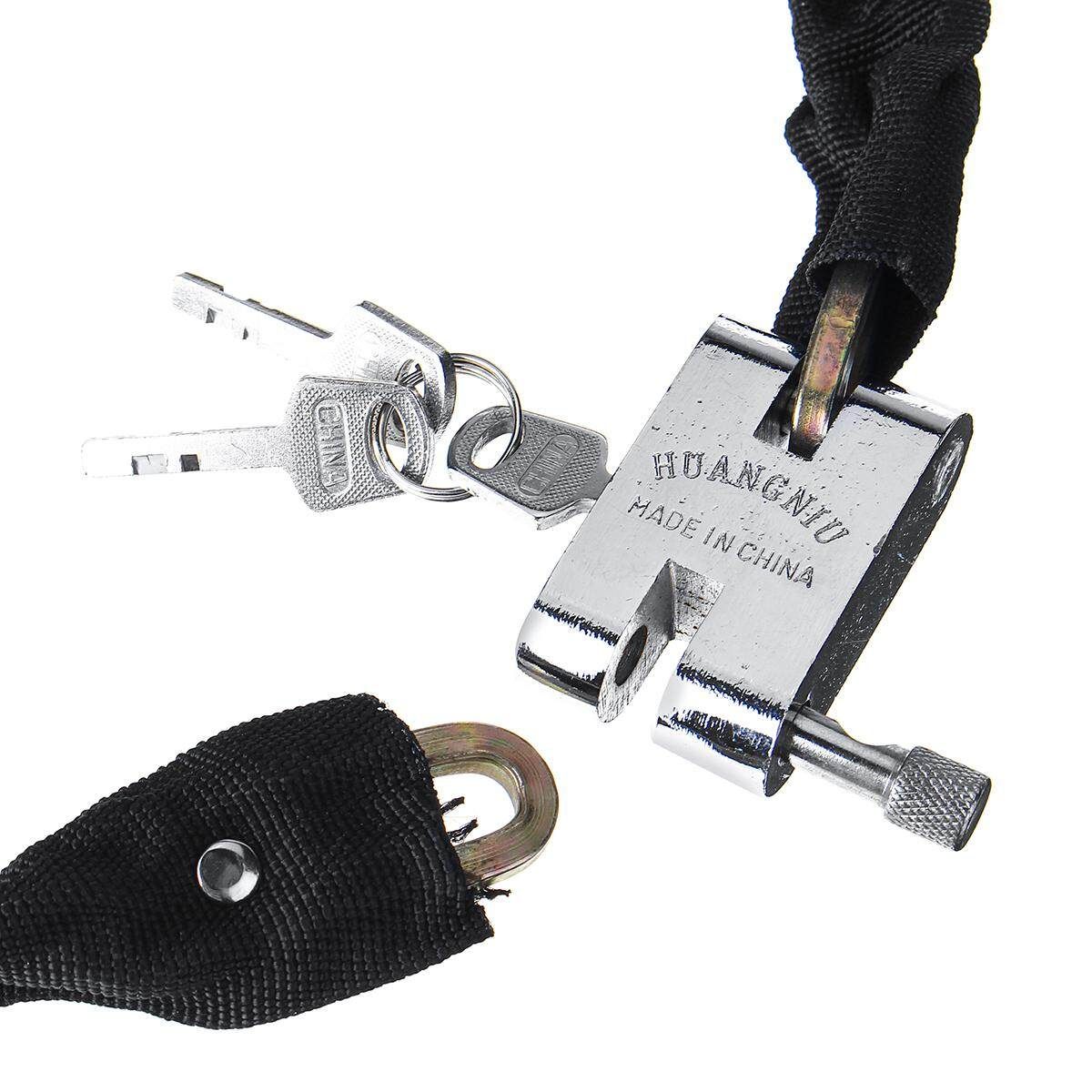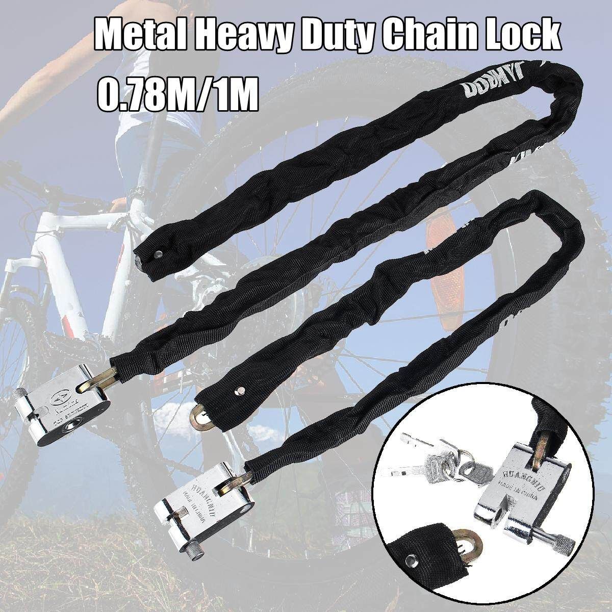 [Note: is the choose of the model,not real ; just means the meaning of the model ] Black 1M Blue 0.78M 0.78M/1M Metal Motorbike Motorcycle Bicycle Heavy Duty Chain Lock Padlock Bike Cycle Feature: 1. A professional quality Heavy Duty Chain and Pad Lock. 2. Guard against theft. 3. Fix with solid square chain. 4. Have 3 keys. 5. Protective textile outer sleeve protects paintwork and rims. 6. The lock body made of durable steel and covered by black oxford fabric. 7. Durable oxford protective cover protects from scratching your wheel and . 8. Easy to storage, fix the lock to the frame while riding. 9. Suitable for motorcycle, bicycle, Door, and a wide range of security applications. Specification: Material: High quality hardened steel Main : Black Weight:0.5KG/1KG Length: 0.78m/30.7", 1m/39.4" Lock size: 5.9 x 4.6cm/2.3x1.8" Lock catch thickness: 7.6mm/0.3" Chain thickness: 5.5mm/0.2" Package Included: 1 x Motorcycle scooter bicycle heavy duty chain lock Note: 1. Please allow 0.5-1cm differences due to manual measurement. 2. Due to the light and screen difference, the item's may be slightly different from the pictures.
