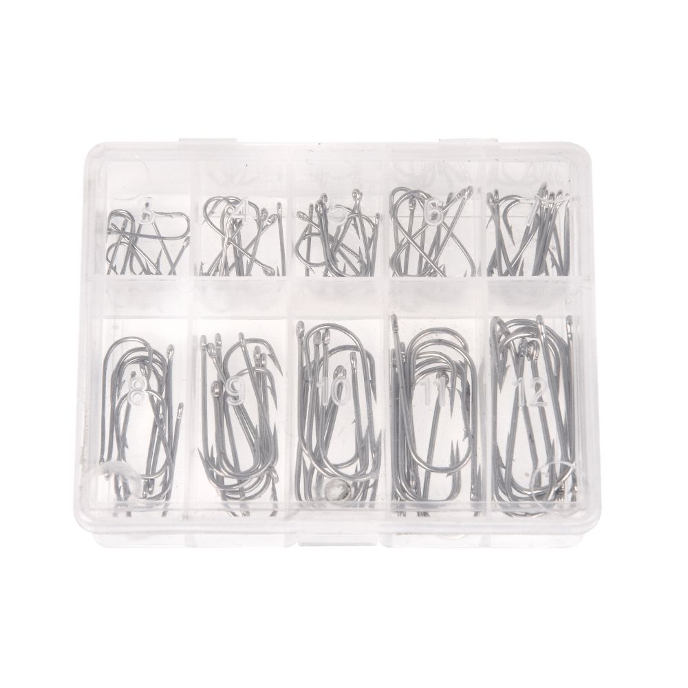 Includes 100pcs fishing hooks in different size from 3# to 12#.