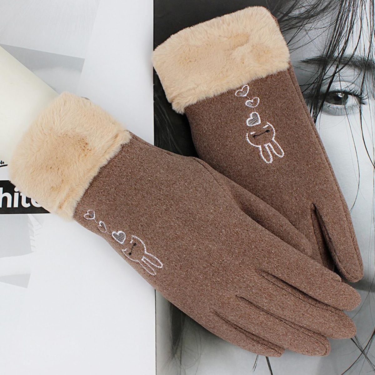 Features: Fluffy Lined, Embroidery Rabbit Pattern, Touch Screen