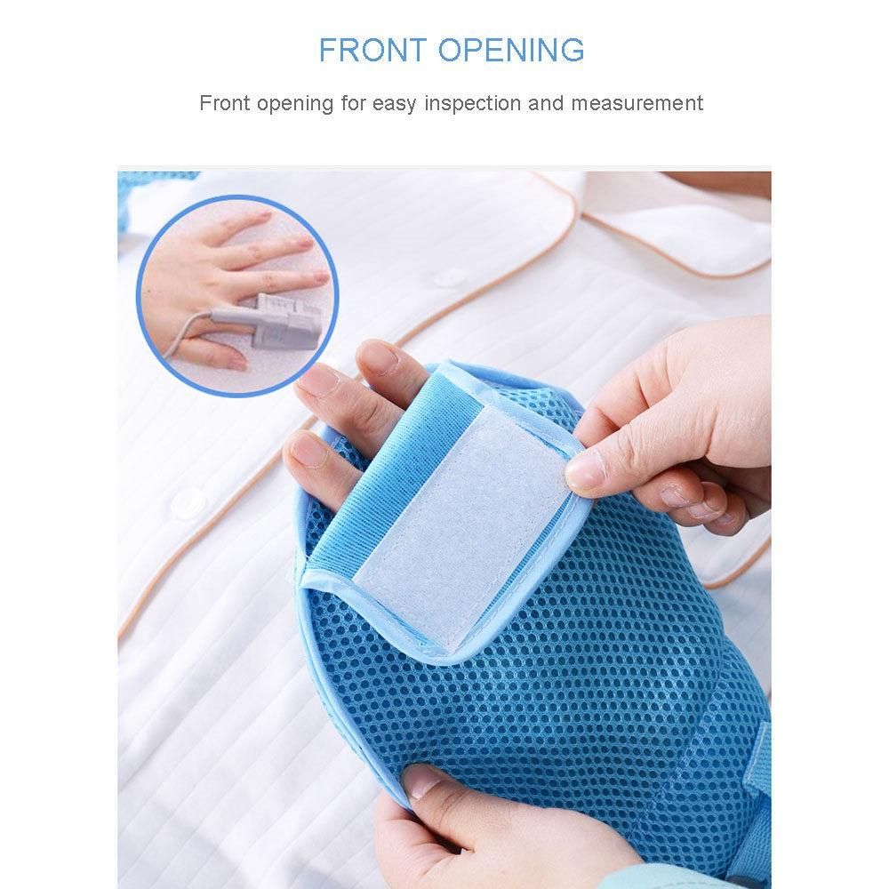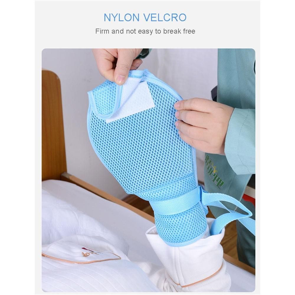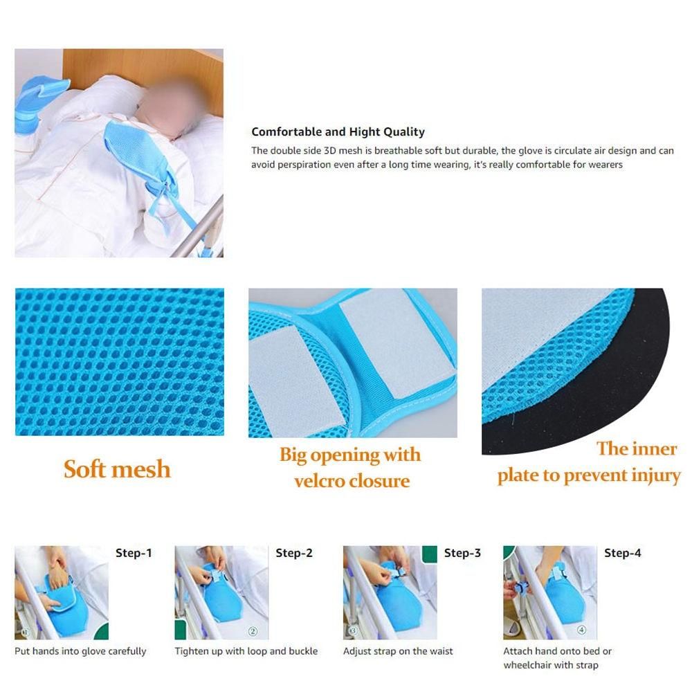 Safety: The adjustable buckle and the durable strap make it safe to prevent the patients from lifting the gloves themself, the adjustable strap can be used to attach hand onto bed or wheelchair to protect patients and caregivers from accidents, self-harm, finger infection, and finger harm etc