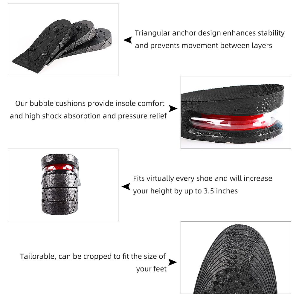 Product description:- 【Adjustable Height】 4 layers design, Adjustable Height-Increase(3-9cm / 1.18-3.52 inches), Instantly add at least 1.18 inches to your height, the heigt can be from 1.18 inches to 3.52 inches, 1 layer=1.18 inches, 2 layer=1.96 inches, 3 layer=2.74 inches, 4 layer=3.52 inches. Our inserts can be detachable and used independently.