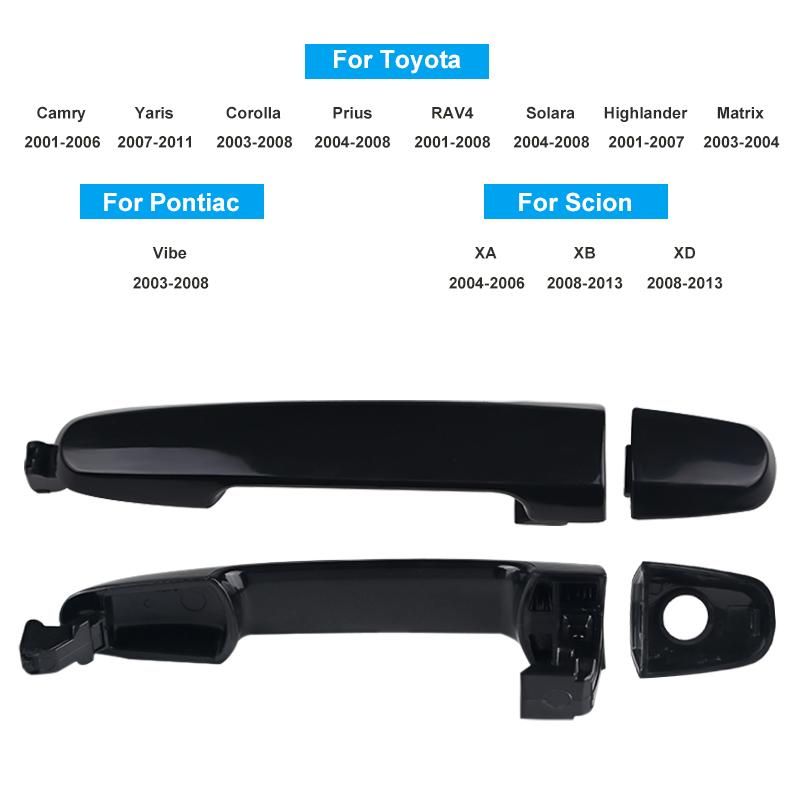 Feature:- This is a car left & right exteriordoor handle repment handle.- Can be repd separately, non-destructive repment, easy to operate.- The left / right exteriordoor panel handlesFor Toyota Camry Corolla RAV4 Prius Yaris Solara Highlander Matrix & Pontiac Vibe & Scion xA xB xD.- Made of high quty materials, ABS material, environmentally friendly, good touch and durable.Specification:Material: ABSColor: BlackOEM: 69211-AA010 / 69211-AA020Description:For Toyota Corolla 2004-2014For Toyota Matrix 2003-2008For Toyota Hilux 2005-2012For Toyota Yaris 2005-2013Product size: 180mm, 45mm, 18mm(see size chart for details)Installation position: Outside the front and rear left door or outside the front and rear right doorApplicable models: Suitable for Toyota Camry Corolla RAV4 Prius Yaris Solara Highlander Matrix & Pontiac Vibe & Scion xA xB xDNote:1. Due to manual measurements, different measurement methods and tools may have slight dimensional deviations.2. Due to the light, angle and display, the image may not reflect the actual color of the project. thank you for understanding.3. If you do not install it, it is recommended to go to the repair shop for installation.The kit includes:1 pcs front door or back door exteriordoor handle
