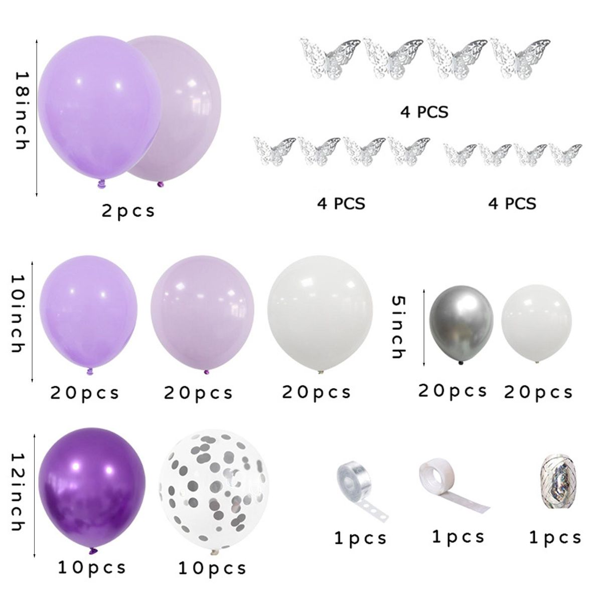 This balloon set contains 122 balloons, 1 roll of balloon chain, 1 roll of dotted, 1 roll of rope and 12 butterfly patches.