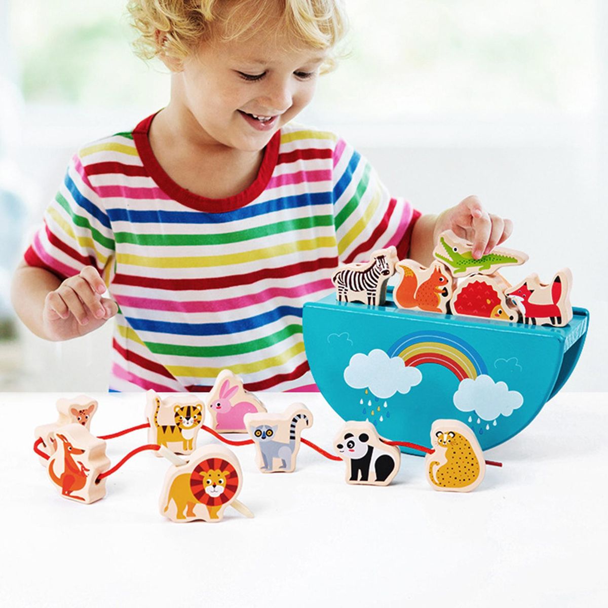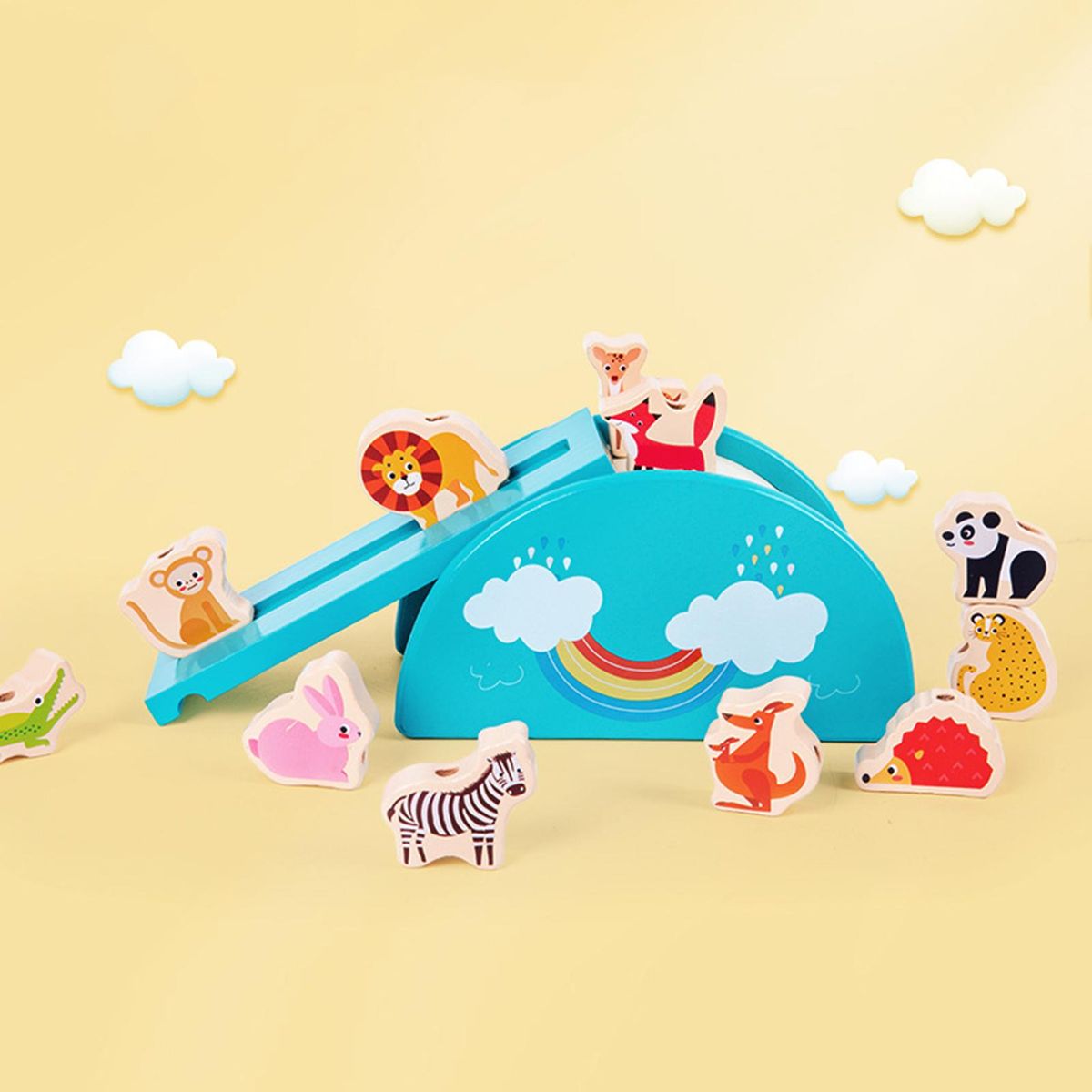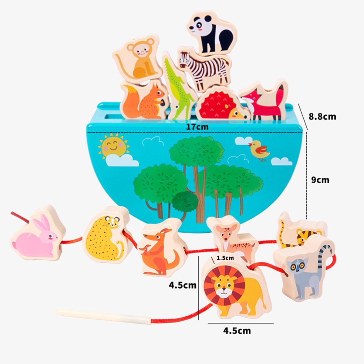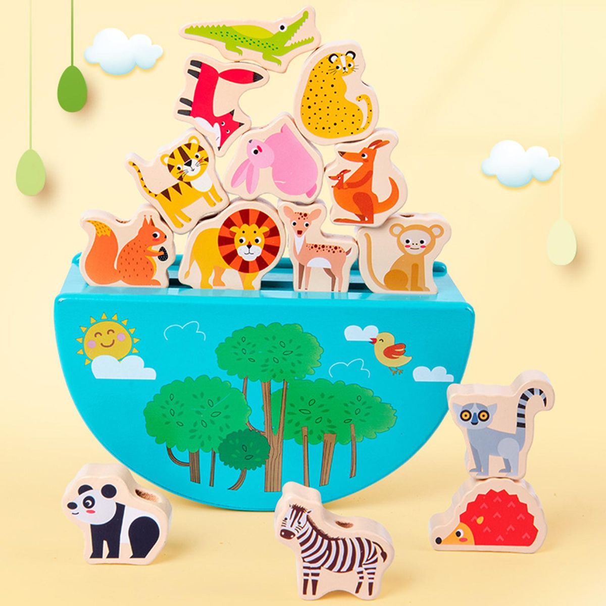It is constructed of wooden material. The base is in the shape of a boat with raised ends. Your child can challenge to stack all animal blocks on the base, which will be more challenging.