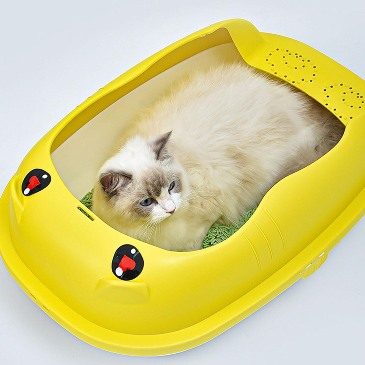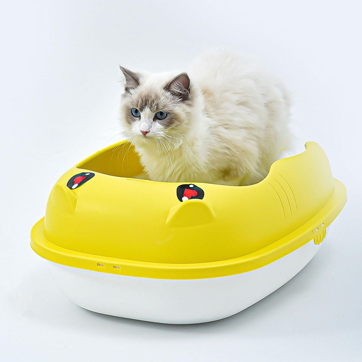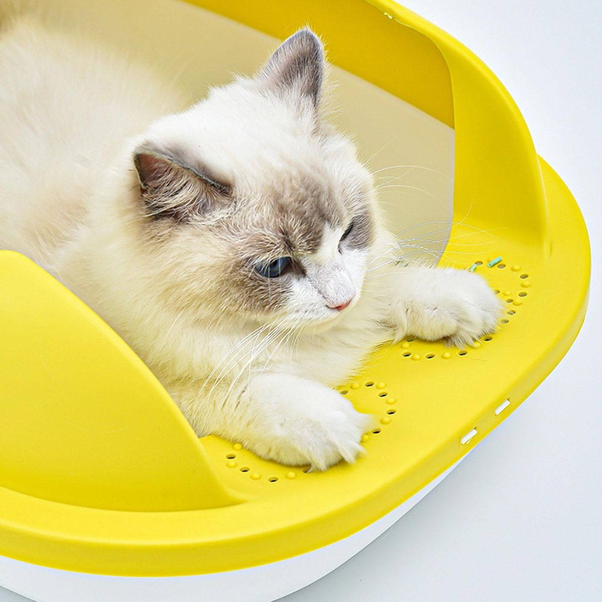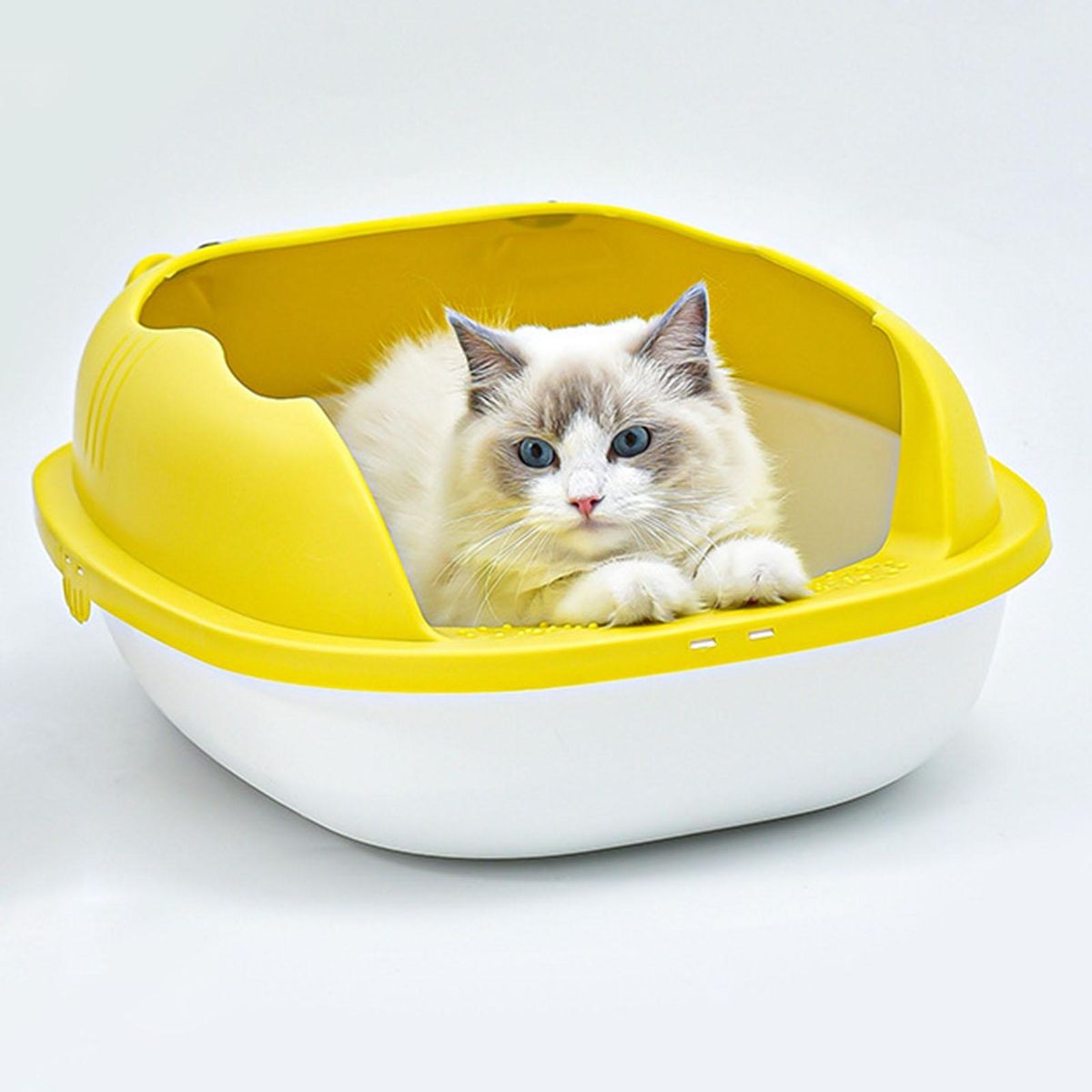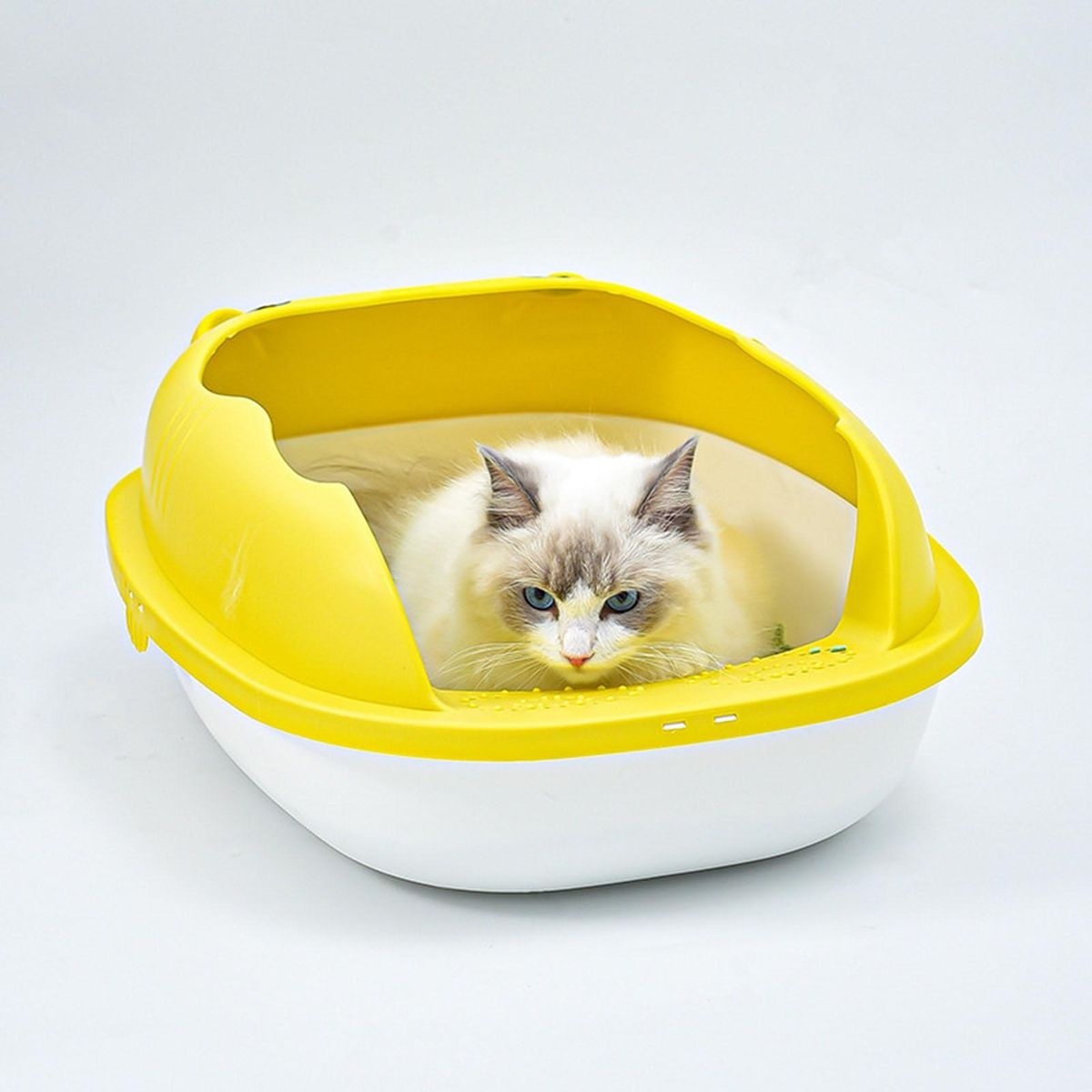 Cat litter basin adopts detachable heightening fence to prevent cat litter from splashing. Moreover, it uses a widened hollow pedal to guide the cat litter in the toe seam of the cat to fall off and prevent the cat litter from being taken out.