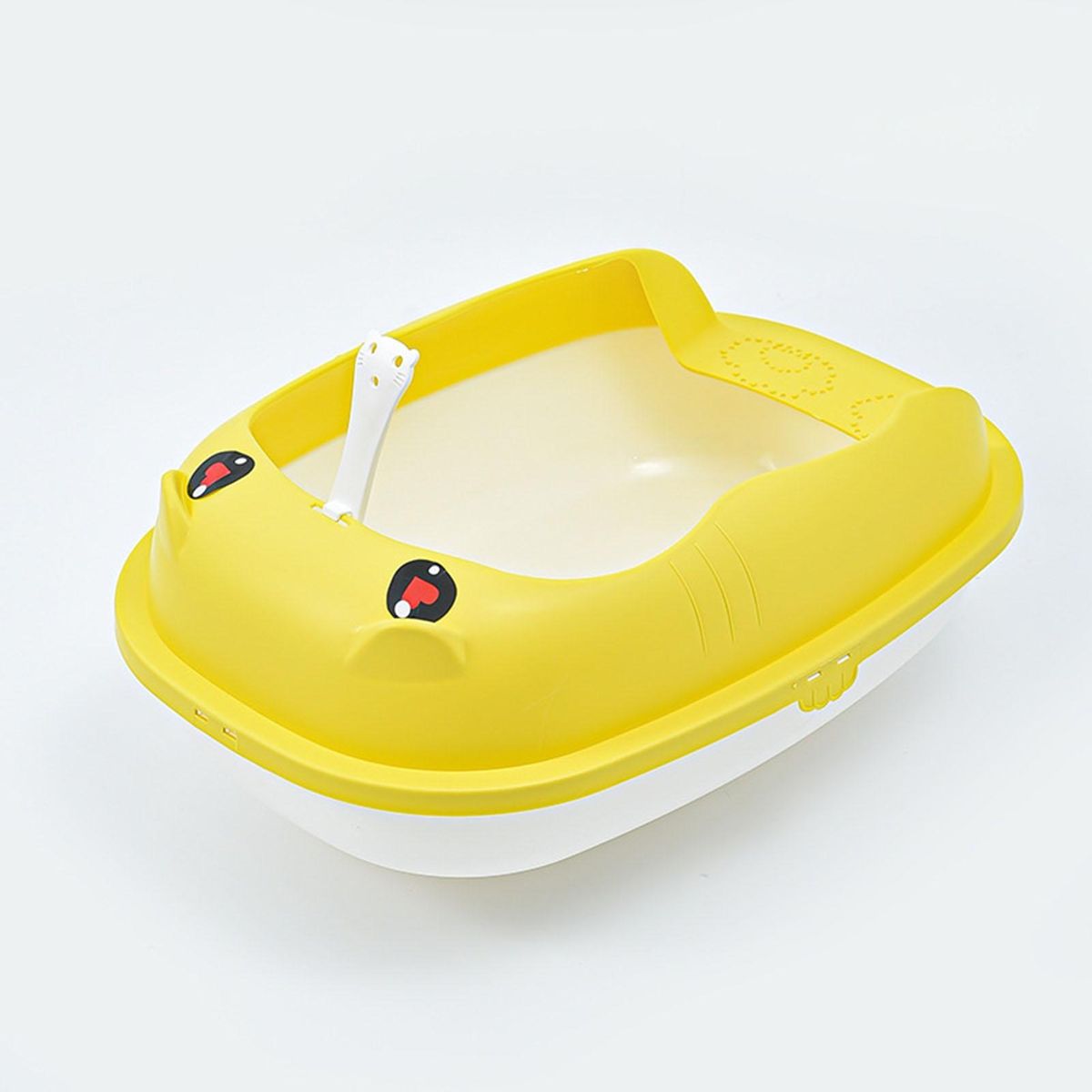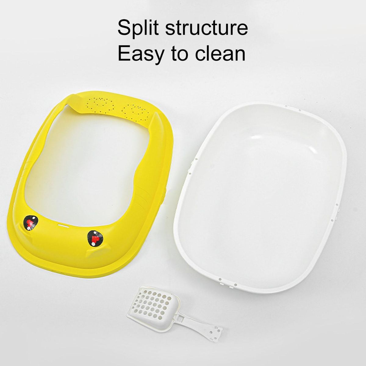 A semi-closed design is adopted in this litter box, and the open space allows air circulation to avoid odor. It is equipped with a cat litter shovel, which can be hung on the basin for easy use.