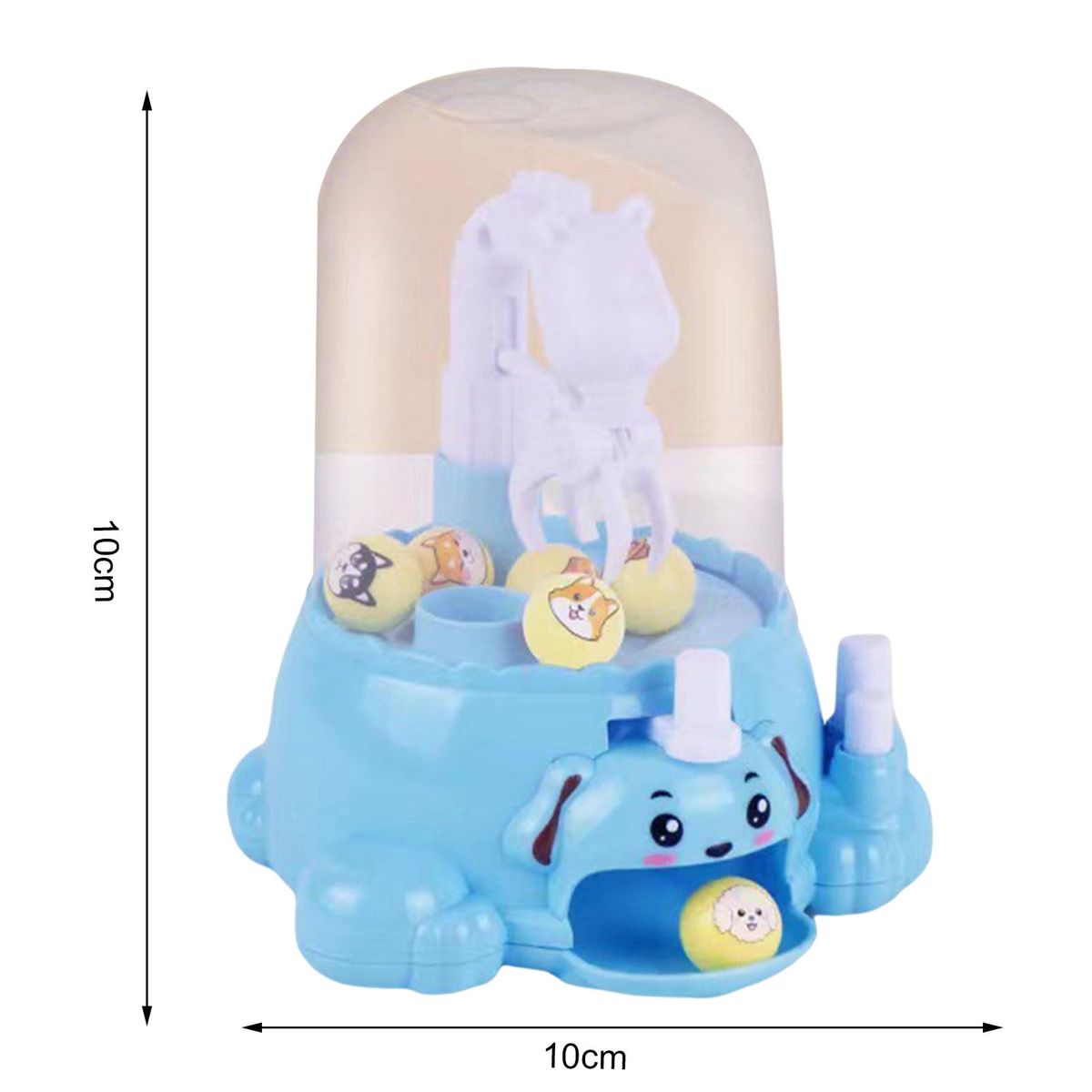 The length of this mini claw machine is 10cm, the width is 10cm and the height is 10cm.