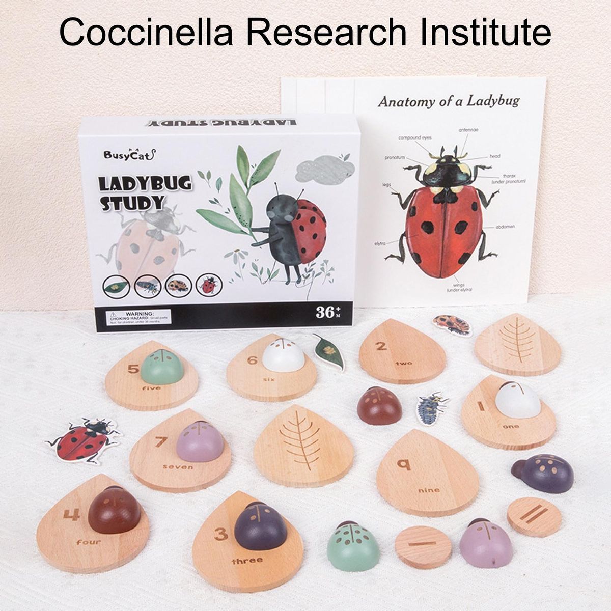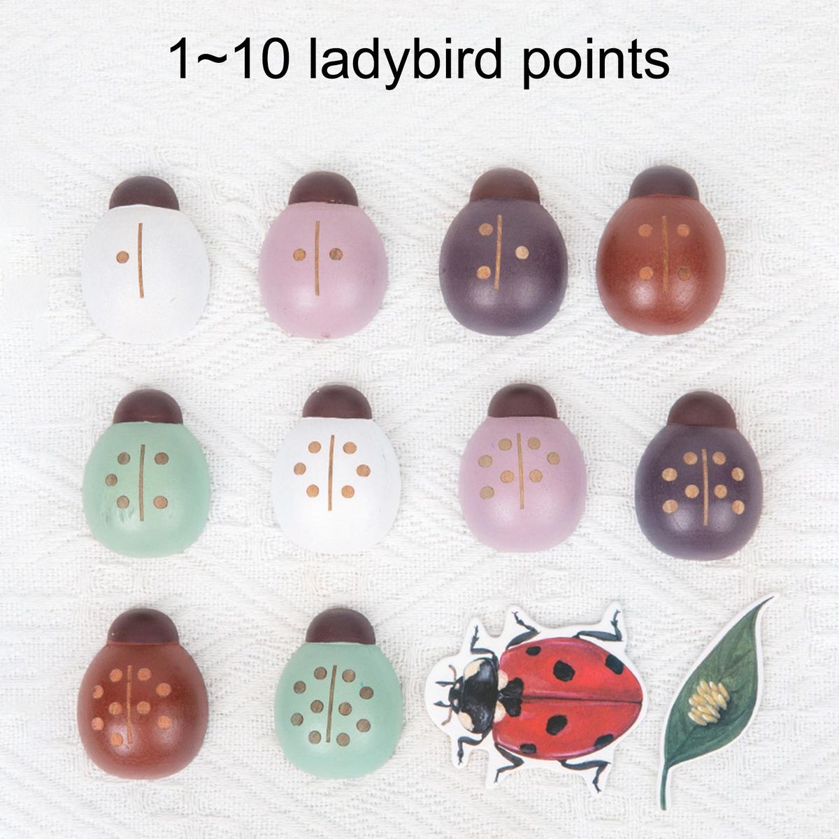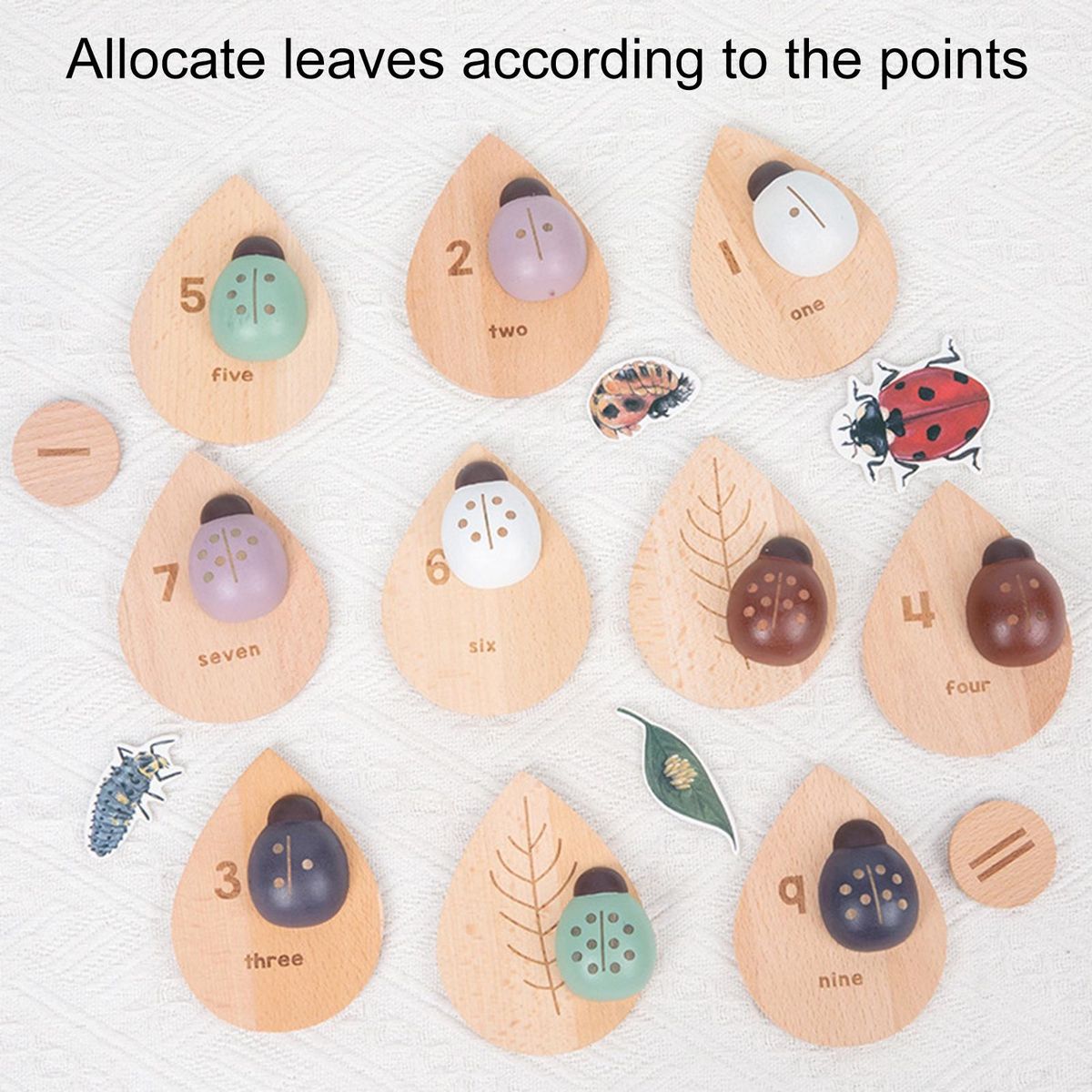 Early education teaching tool ladybug number matching toys round and delicate, smooth and safe for children; double-sided leaf design, with numbers on the front and leaves on the back; equipped with adhesive straps, convenient and practical for children to understand the life cycle of ladybugs.