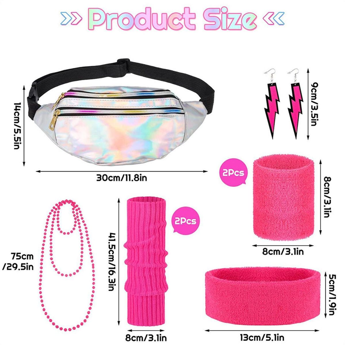 Designed for the 1980s neon party style, this sports set includes a full outfit of earrings, dress and bag accessories in bright, eye-catching colors.