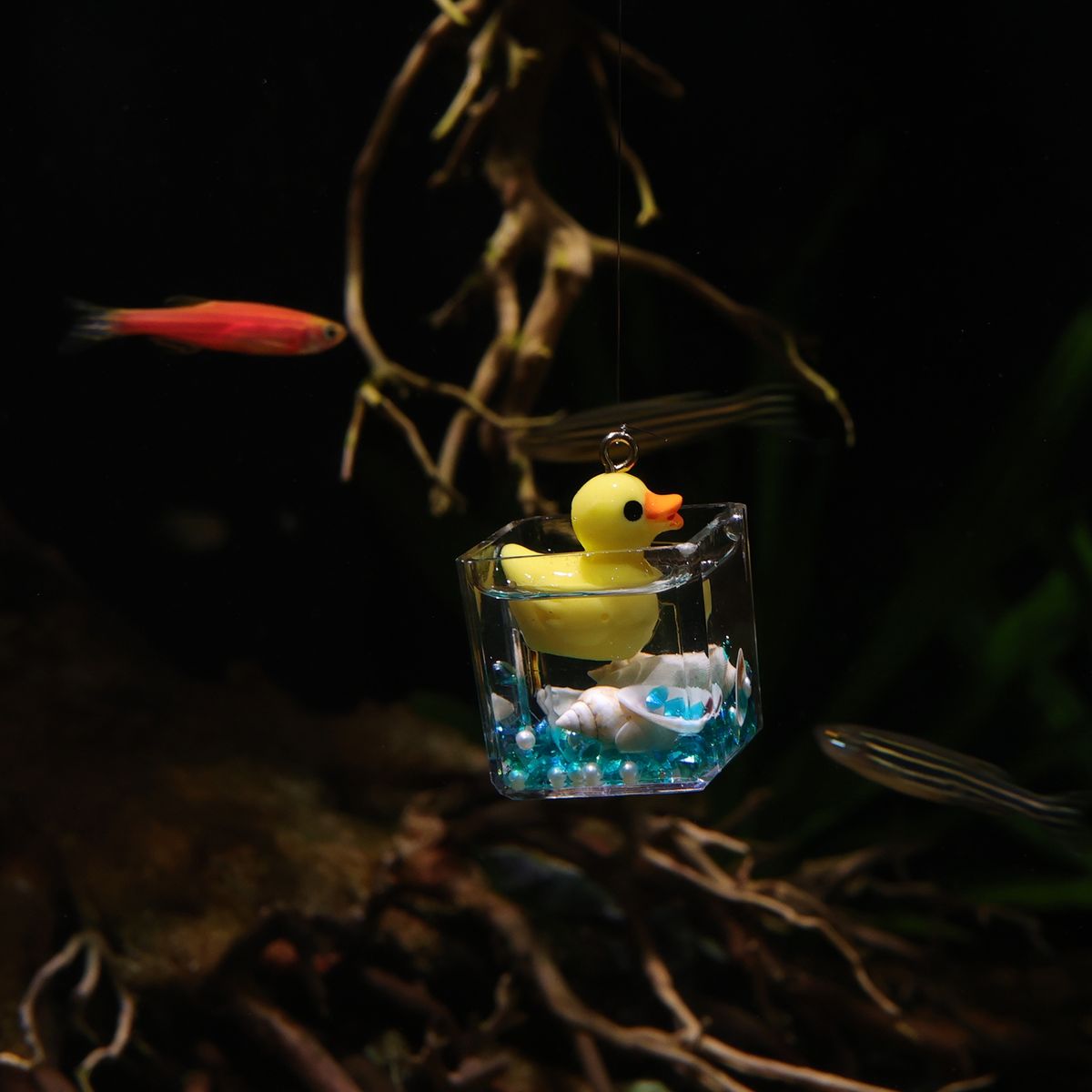 Funny and cute cartoon duck shape, floating with the current, playing and chasing with the fish in the fish tank. It adds a vibrant beauty and natural cheerfulness to the underwater atmosphere.