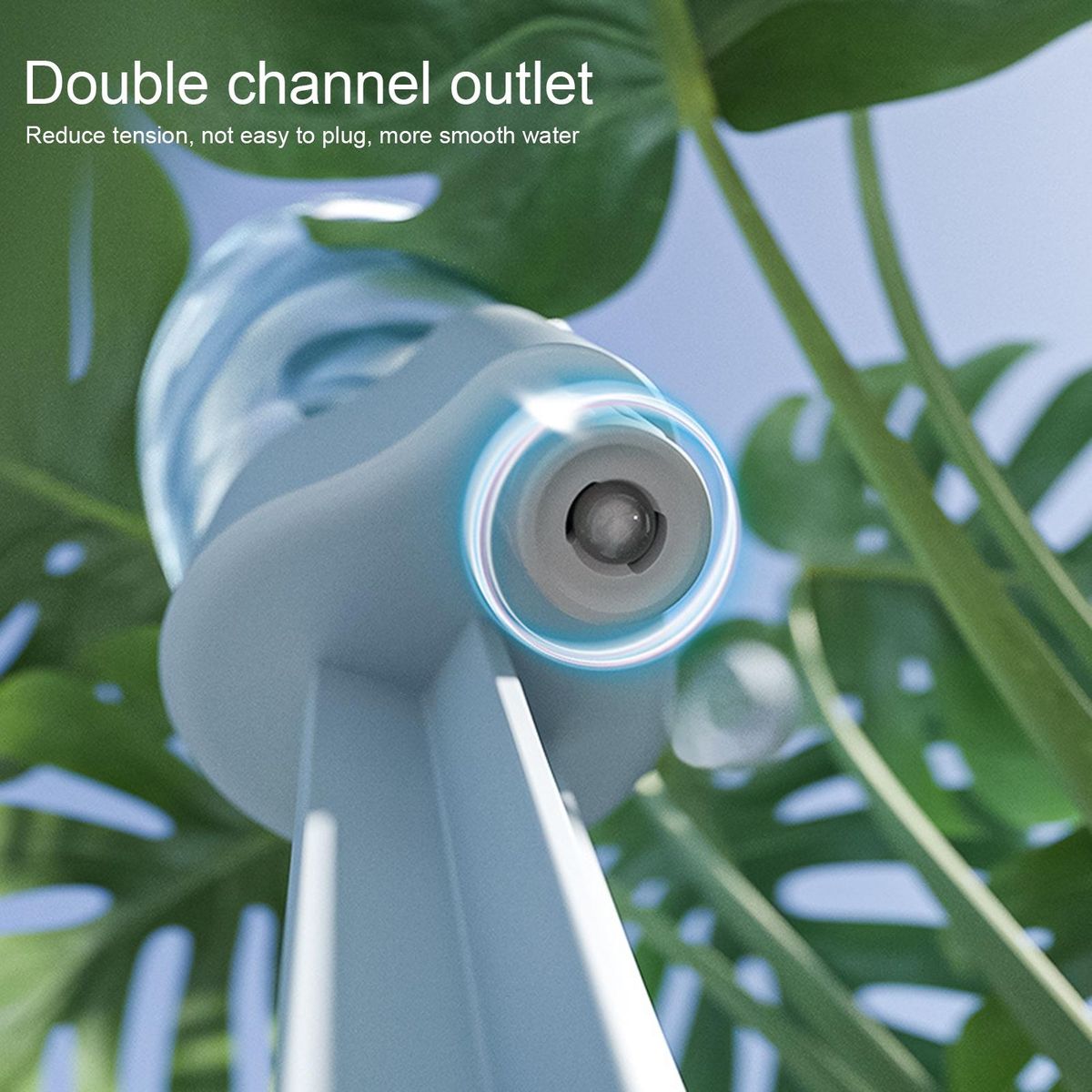 A double-channel water outlet is adopted in this watering device, which reduces tension, is not easy to be blocked, and gives water more smoothly. With a cone-shaped plug rod, it can be easily inserted into theand directly poured into the roots.