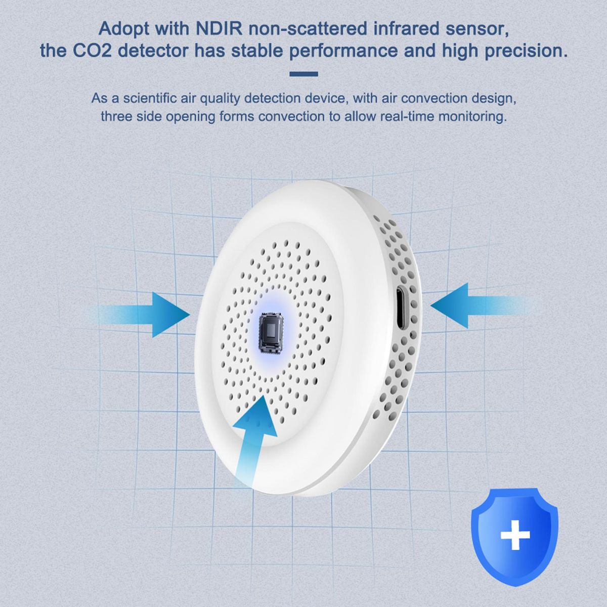 Air detector adopts infrared sensor to measure CO2, temperature and humidity, which is more accurate, more reliable and more durable than traditional electrochemical sensor. It is equipped with a hook, which is convenient to carry and does not take up space.