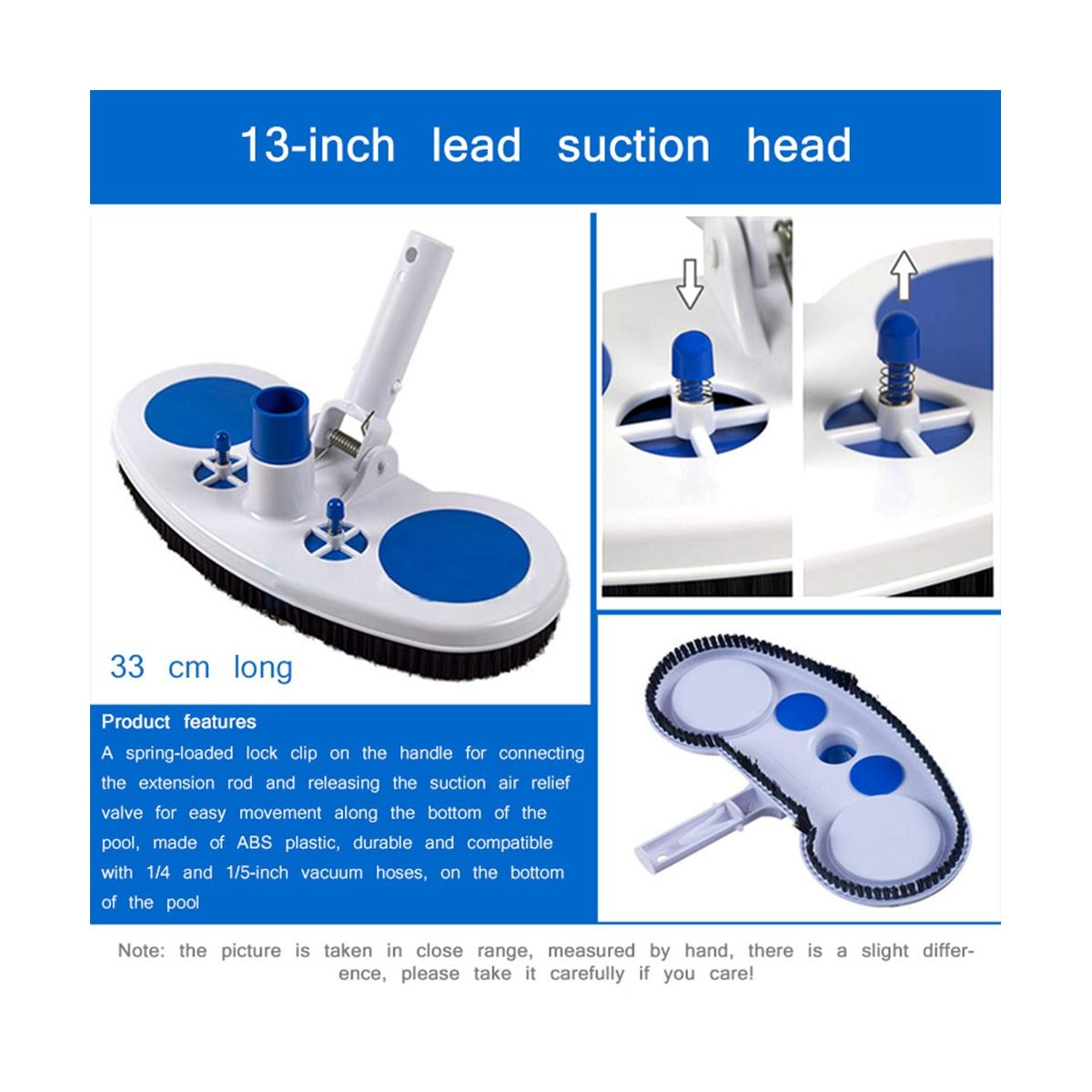 This specially designed vacuum attachment will vent under pressure when attaching a vinyl pool liner. When the vacuum surface is blocked or sealed on the pool floor, its double safety valves can release the suction, thereby reducing the pressure of the filter pump and preventing the vacuum from attracting the pool lining.
