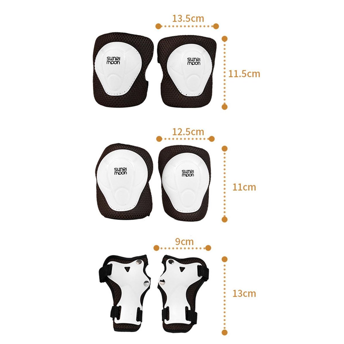 Knee Pad, the length of the product is 13.5cm, the width is 11.5cm. Elbow Pad, the length of the product is 12.5cm, the width is 11cm. Wrist Guard, the length of the product is 13cm, the width is 9cm.