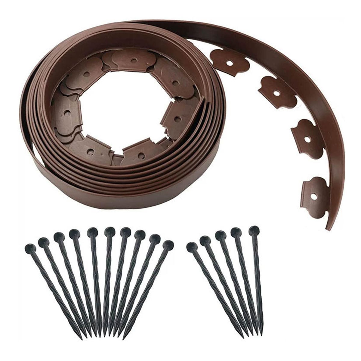 This isolation edging is 5 meters long, 5 cm wide, 0.3 cm thick and the length of the nails is 20 cm.