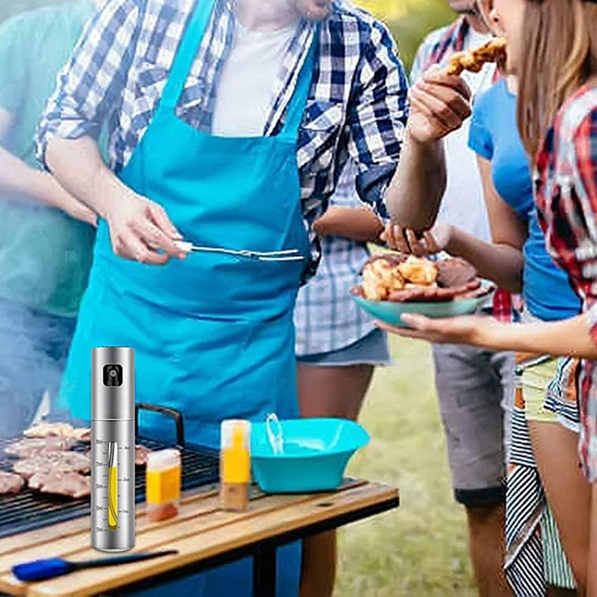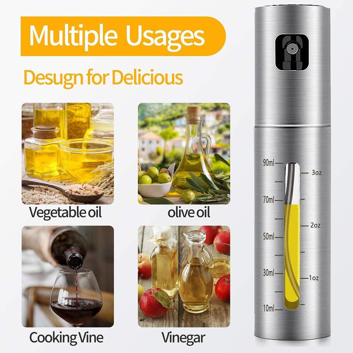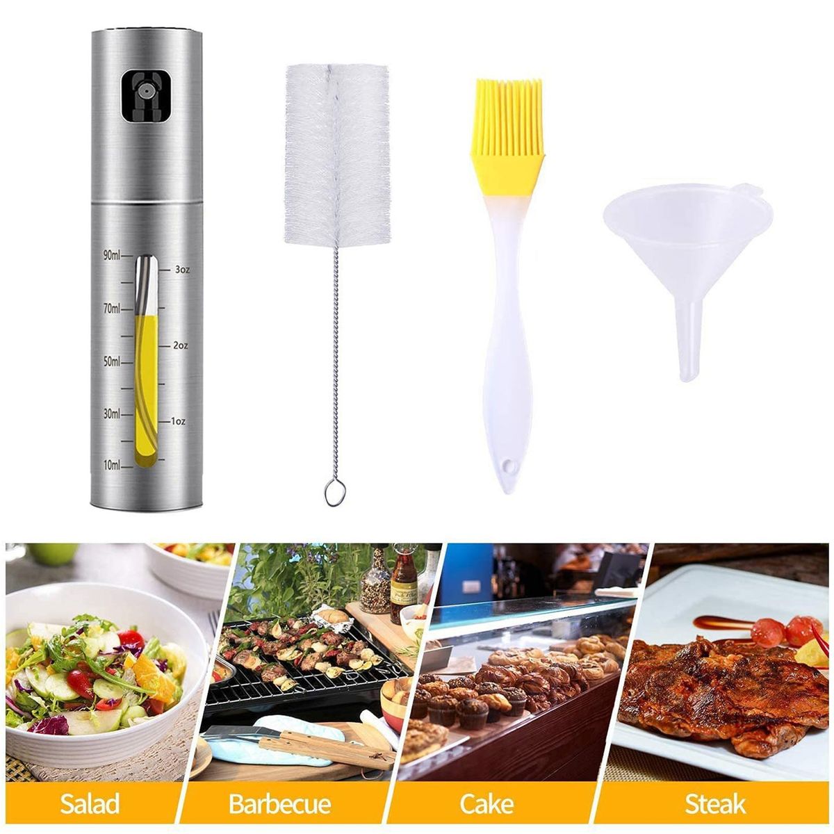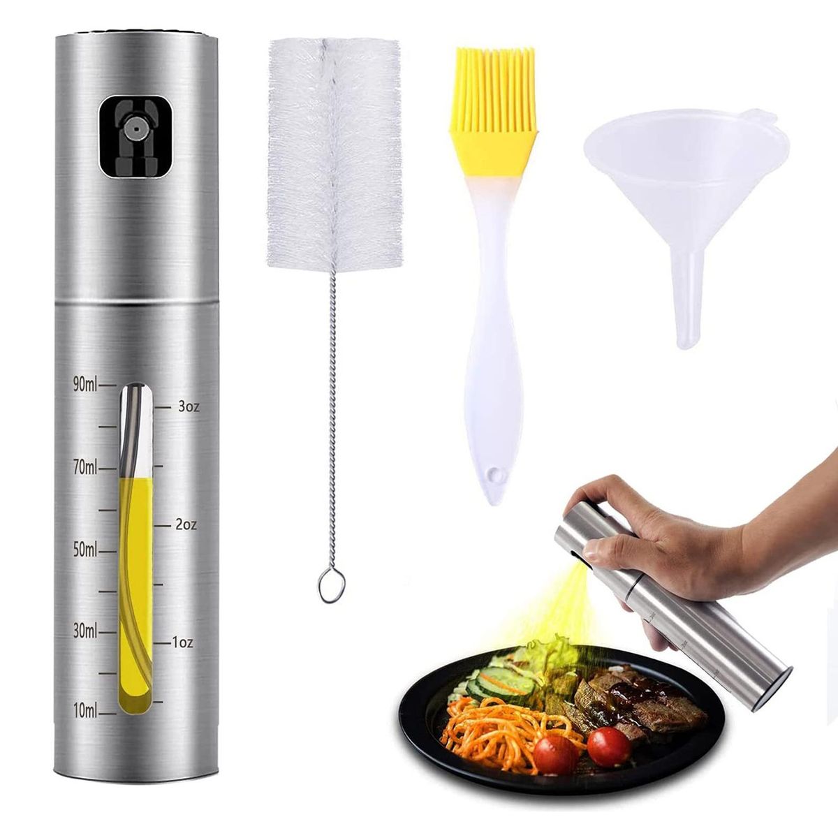An oil spray bottle adopts visual design, so as to check the remaining situation and replenish it in time. With double scales, it can control the dosage and is convenient to use.
