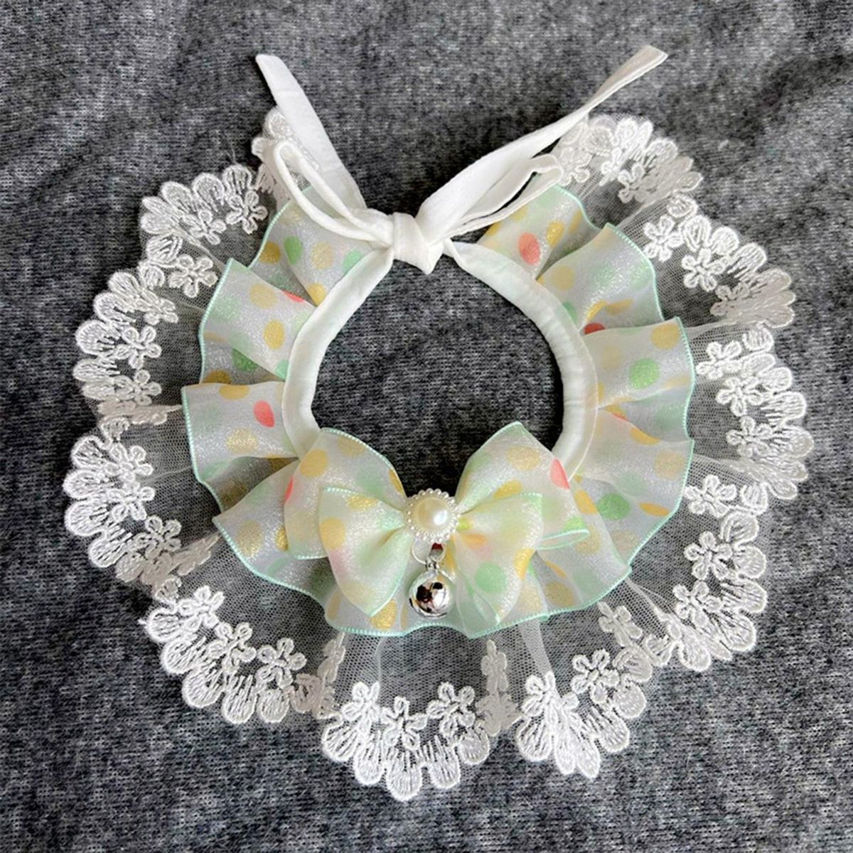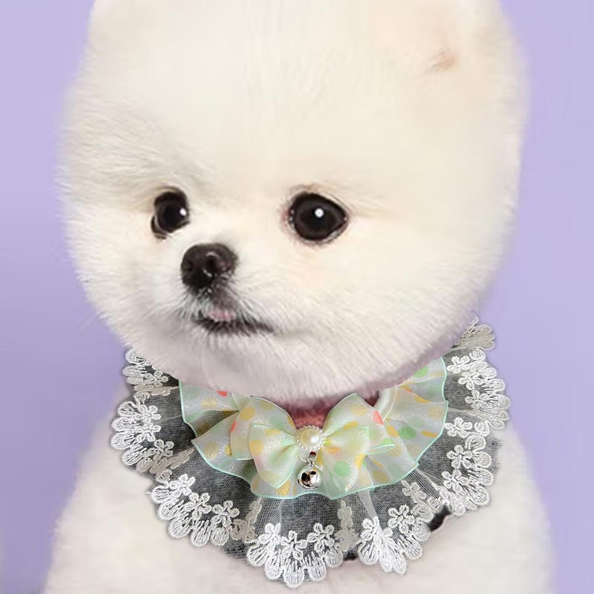 A pet collar is decorated with bows, bells andpearls, which are spliced with lace. It is colorful and exquisite in workmanship. It is tied with a strap and can be adjusted in size.