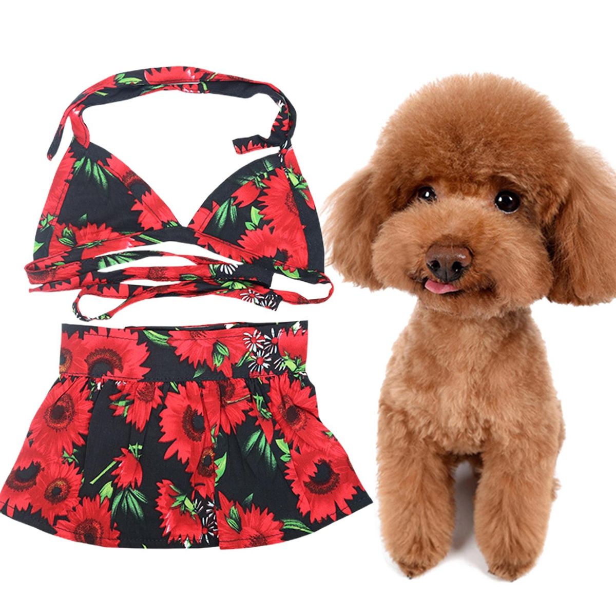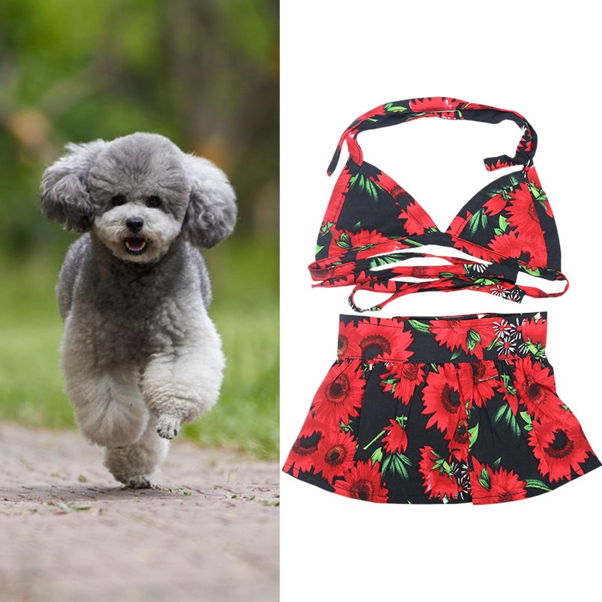 A pet swimsuit consists of a top and a skirt. The top is designed with lace-up and the skirt is designed in hook and loop, which is convenient to put on and take off. It is printed with floral prints, with bright colors and exquisite workmanship.