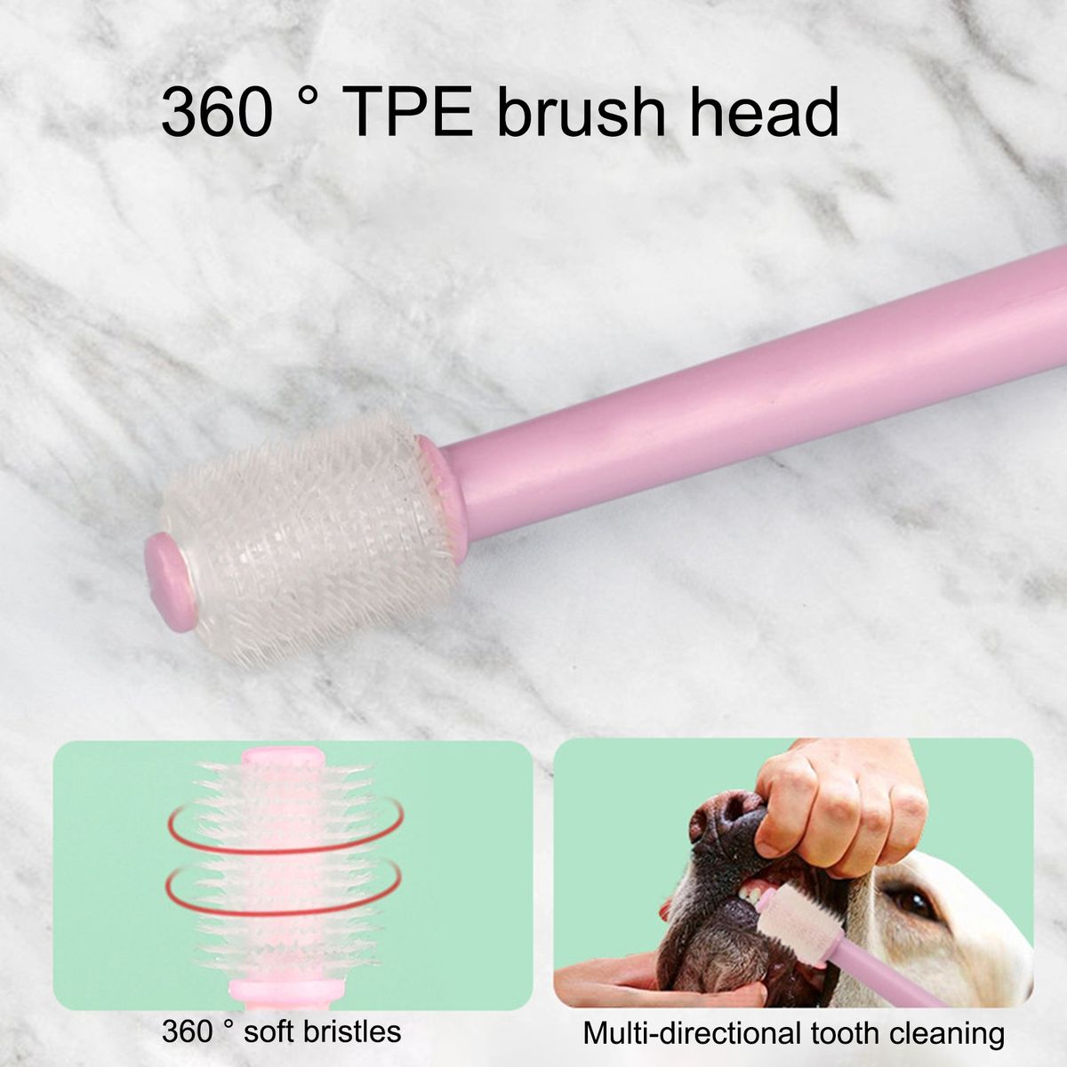 Compared to other similar products on the market, this pet toothbrush is designed with 360-degree soft and flexible bristles, so it has an ability to deeply clean food residues, teeth stains, plaque and tartar, while freshening breath.