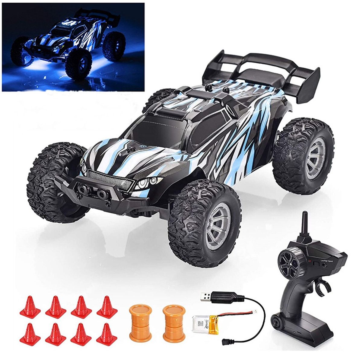 Simulation off-road racing car, large tires with bump pattern, cool LED light, anti-skid shock absorption. Good climbing performance and crash worthiness enable it to climb complex road conditions, and the remote control operation is more realistic.