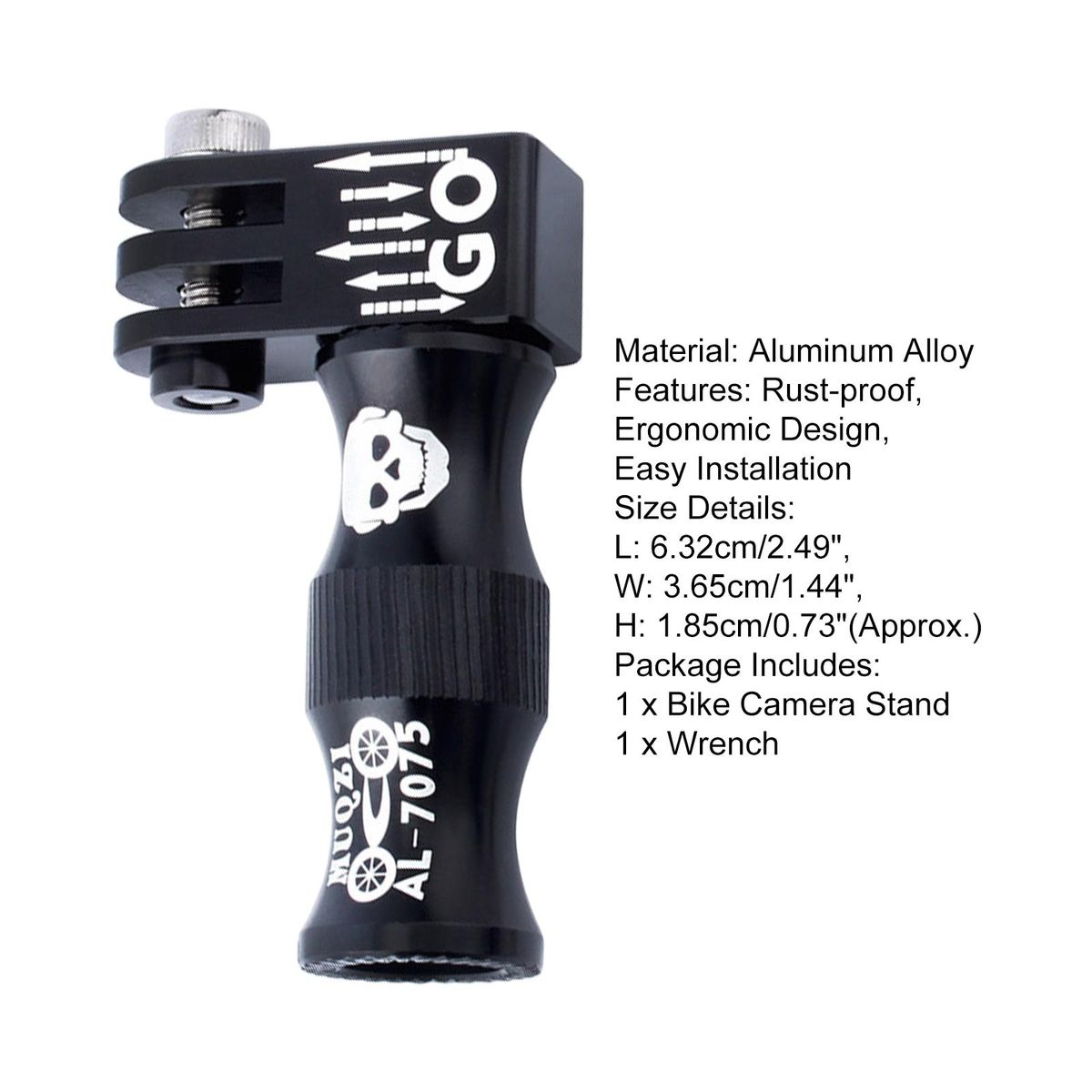 The length of this bike camera stand is 6.32cm, the width is 3.65cm and the height is 1.85cm.