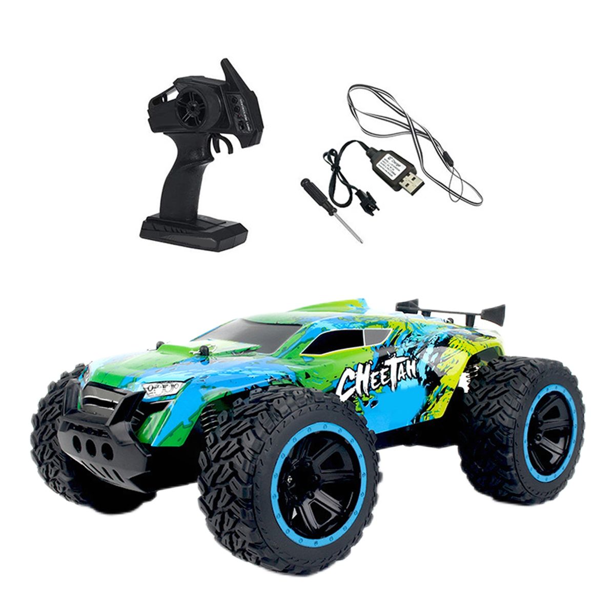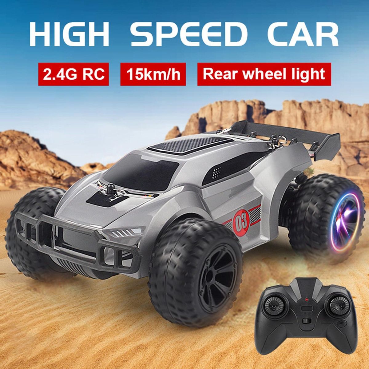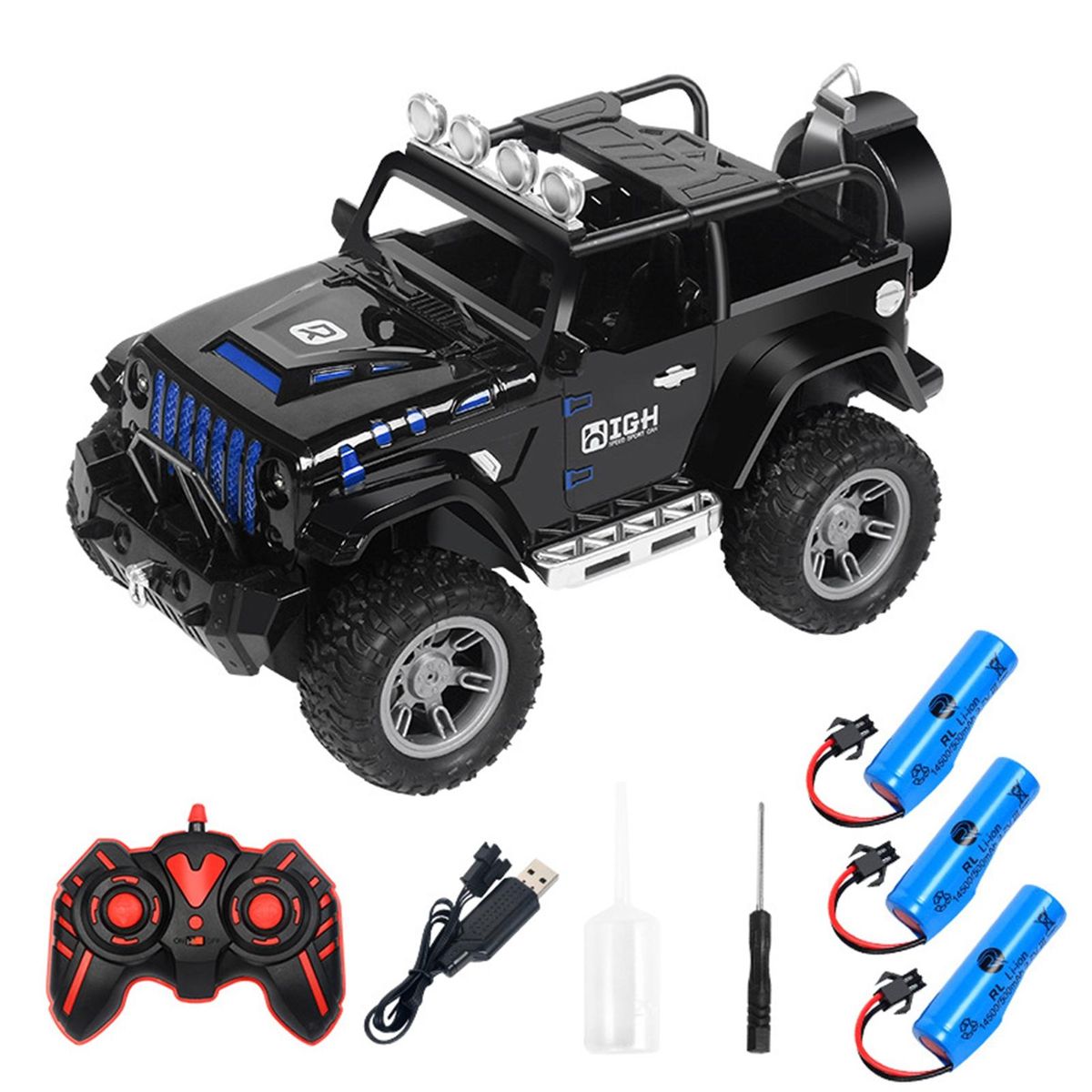 Simulation off-road racing car, large tires with bump pattern, cool LED light, anti-skid shock absorption. Good climbing performance and crash worthiness enable it to climb complex road conditions, and the remote control operation is more realistic.