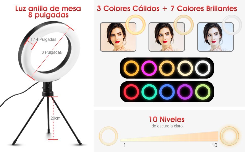 - ▶ 【8 inch & 2700k to 5500K adjustable LED ring light】: ELEGIANT Selfie ring light with tripod is more powerful. The diameter of the ring span is 8 inches and the width of the ring is 1.14 inches. The table ring light consists of 72 pieces of LED beads. Our color temperature is adjustable from 2700k to 5500K.