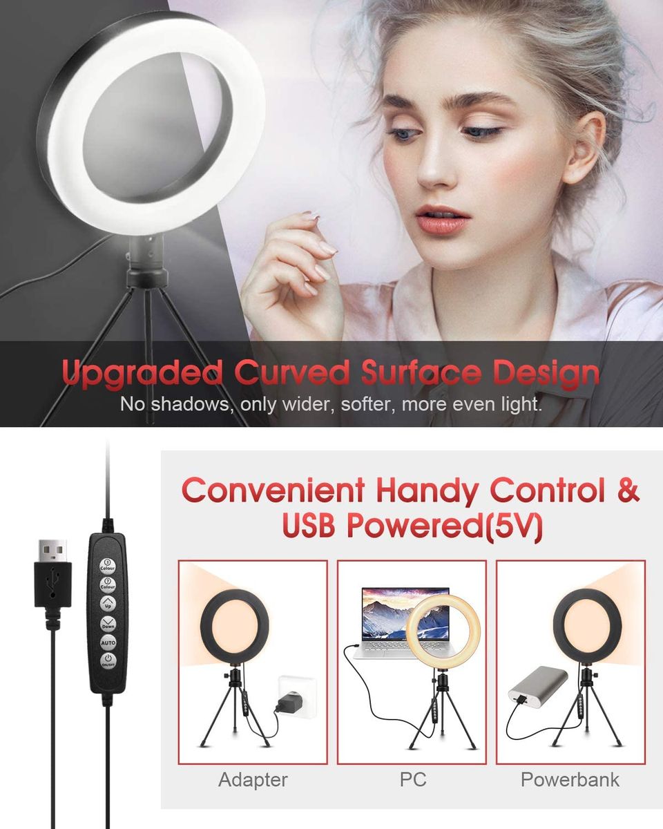- ▶ 【With USB connection & Extensive use】: Our selfie ring light tripod is with USB connection. With the 3A controller you can turn on the LED ring light directly, change modes and control light levels. You can plug the USB connector into a PC, adapter or power band. Plug and play. Easy power supply. This ring light can be used for YouTube videos, live broadcast, makeup, desktop, selfie, portrait, makeup, etc.