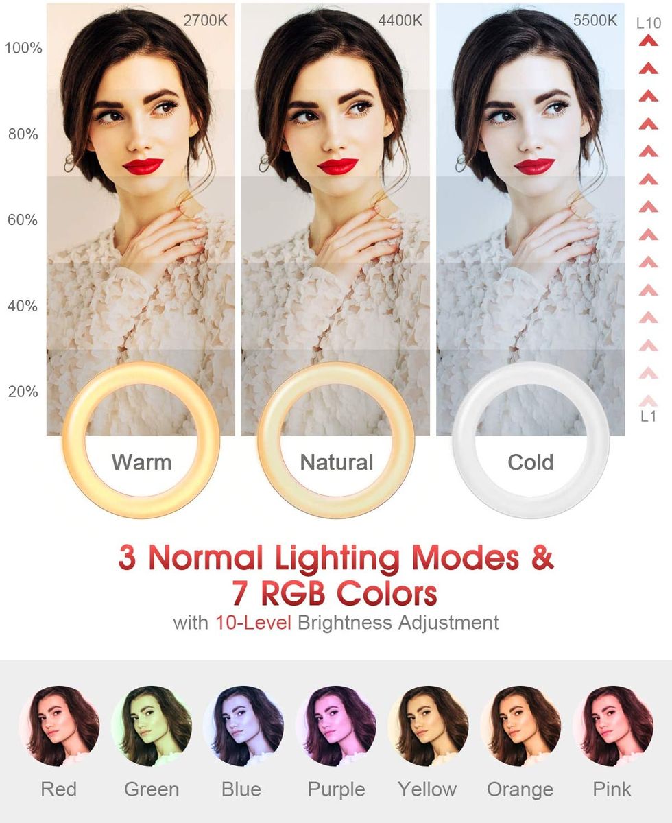 - ▶ 【10 RGB color changes & 10 brightness levels】: ELEGIANT LED ring light has 10 light colors, not only warm, warm white, white, but also 7 color changes, namely red, green, blue , mixed white, yellow, pink, orange available. Each light color has 10 different brightness. Bright colors can create a unique atmosphere and meet your diverse needs.