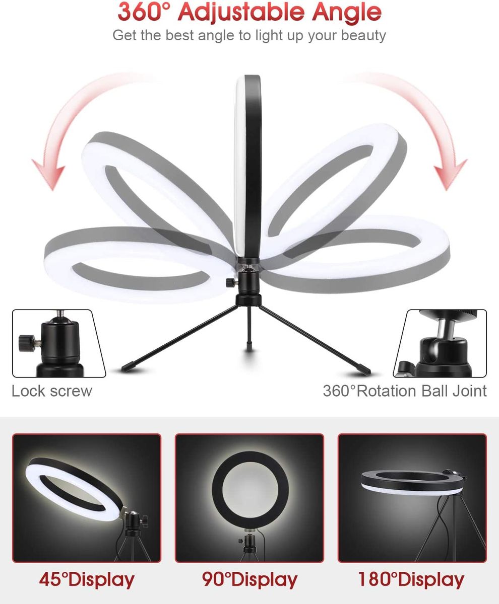 - ▶ 【360 ° Rotating Ring Frame & Adjustable Tripod】: The ring light frame can be rotated vertically 360 degrees. You can create the three angles according to your needs. The 20cm tripod with screw cap can be freely mounted and folded. You can also adjust the height of the tripod.