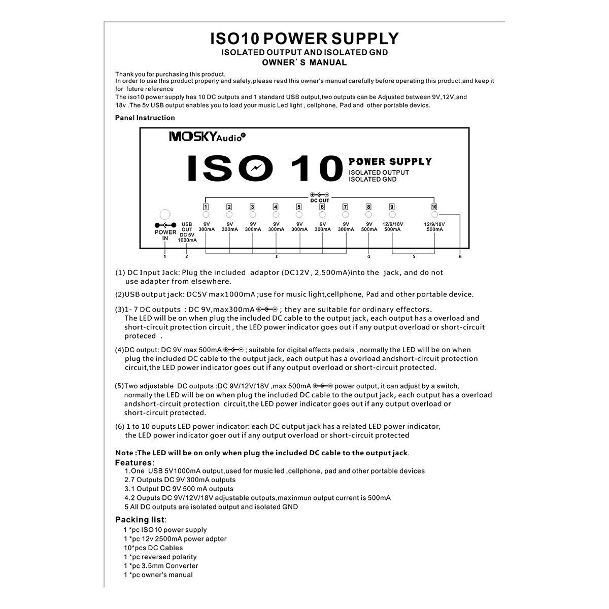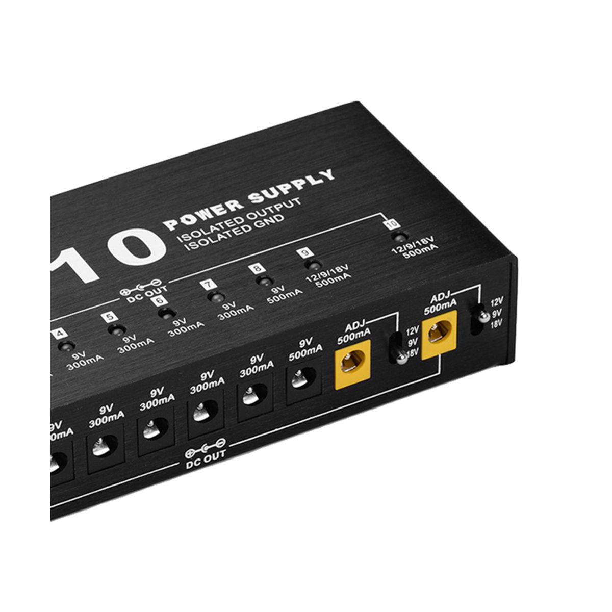 10 isolated DC outputs: the 1st to 7th output DC 9V 300mA, the 8th output DC 9V 500mA, the 9th and 10th output DC 9/12/18V adjustable voltage, 500mA current.