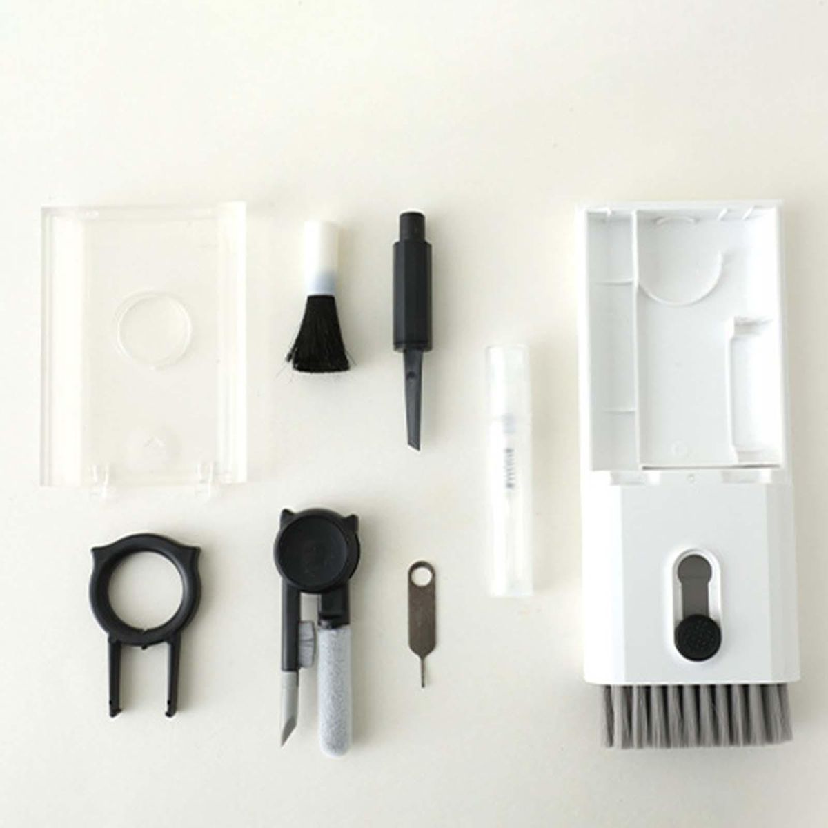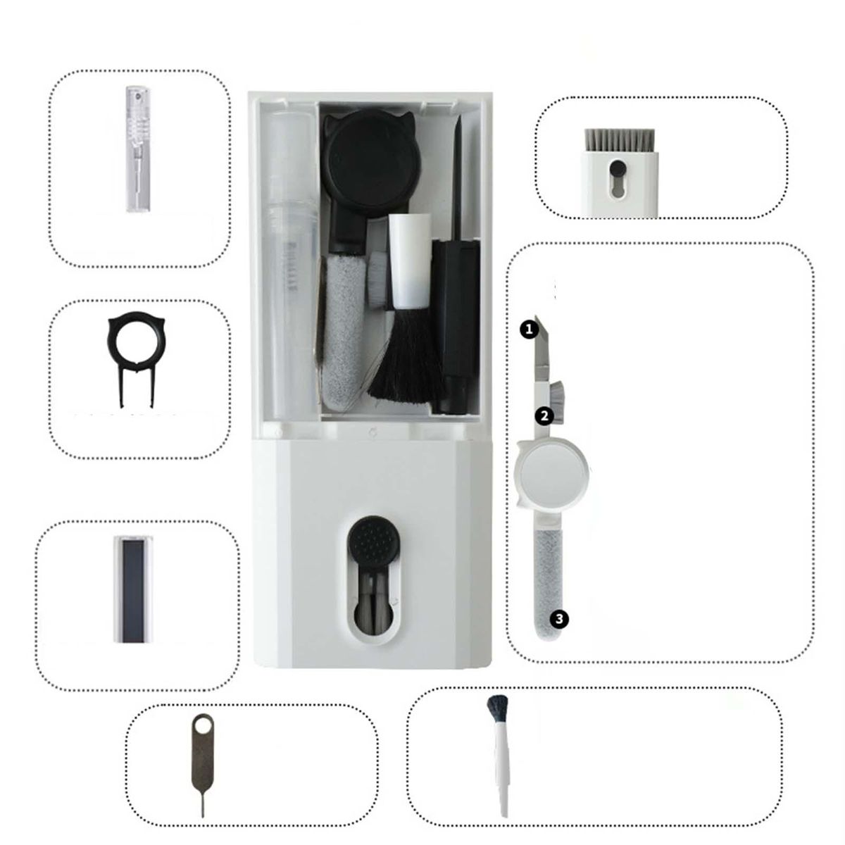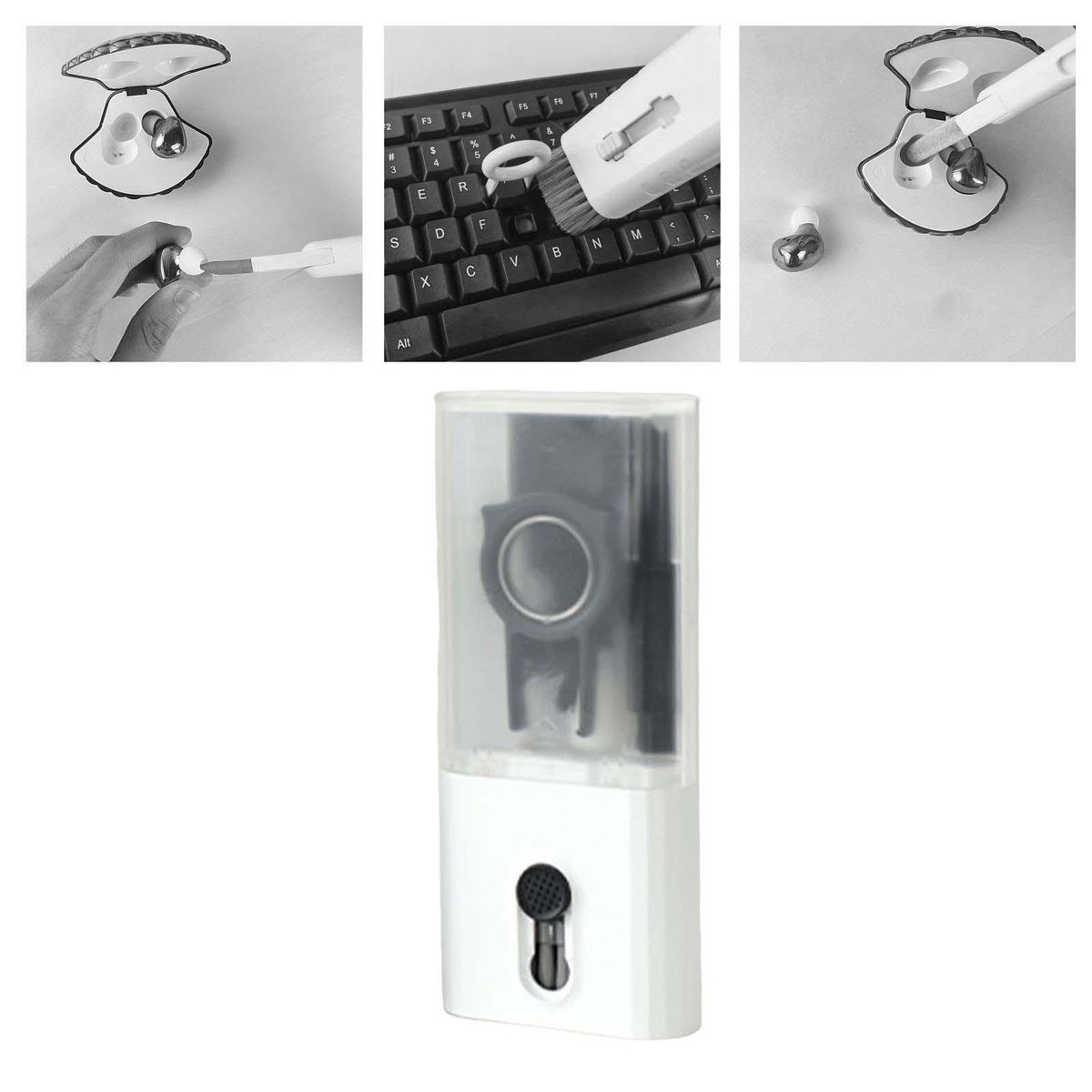 10 In 1 Multifunctional Cleaning : A total of 10 functions for different cleaning site needs, folding cleaning pen with silicone tip and flocking tip, cleaning brush, Key puller, microfiber fiber wiping cloth, lens polishing brush, etc