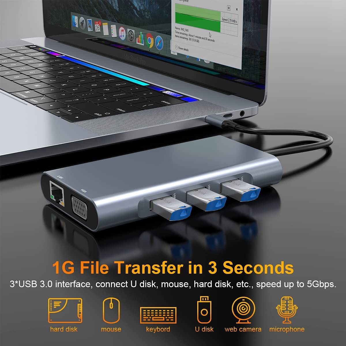 [Audio output and reliable data sync USB 3.0] 10-in-1 USB-C hub with 3.5mm audio jack. Listen to your favorite music with wired headphones using the classic 3.5mm cable. Three 3.0 USB ports transfer and backup your files. The transfer speed is up to 5Gbps, which is 10 times faster than USB 2.0. Transfer movies in seconds. Connect to your smartphone, tablet or hard drive to transfer data easily. Backward compatible with USB 2.0.