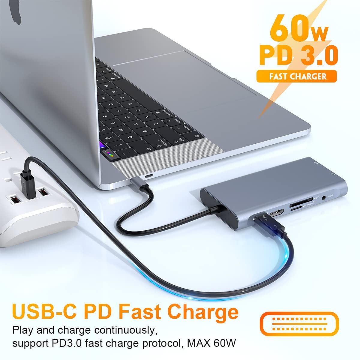 [USBC Hub Dock with 60W Power Delivery and 1000Mb/s Gigabit Ethernet] The USB C Hub Multi-Port Adapter provides a Type-C pass-through female port through which you can safely power a connected MacBook or other Type-C notebook computer charging. The USB C hub is rated at 60W and supports Power Delivery 3.0 technology. Note: The PD port is for charging only. The USB C LAN adapter provides full 10/100/1000 Mbps download speeds via the RJ45 Ethernet port. Reduce latency and make network connections more stable and efficient.