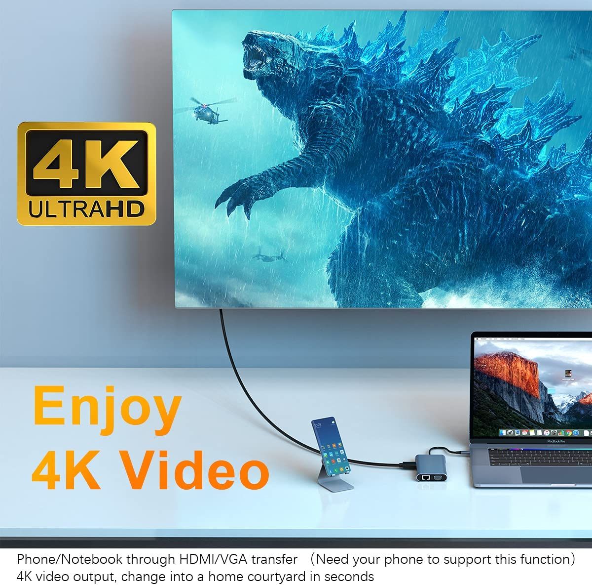 10-in-1 USB C Hub and Powerful Workstation] Multifunctional USB C hub expands from a single USB-C port to 4K HDMI and 1080P VGA video output, Gigabit Ethernet/RJ-45 ports, 3x USB 3.0, 3.5mm Audio, 60W power supply provides Type C charging port, SD/TF card reader. The hub can use SD card slot and TF card slot at the same time. USB C Dock works with MacBook/Pro/Air, Type-C laptops and Windows laptops. Let your notebook expand more possibilities and improve work efficiency.