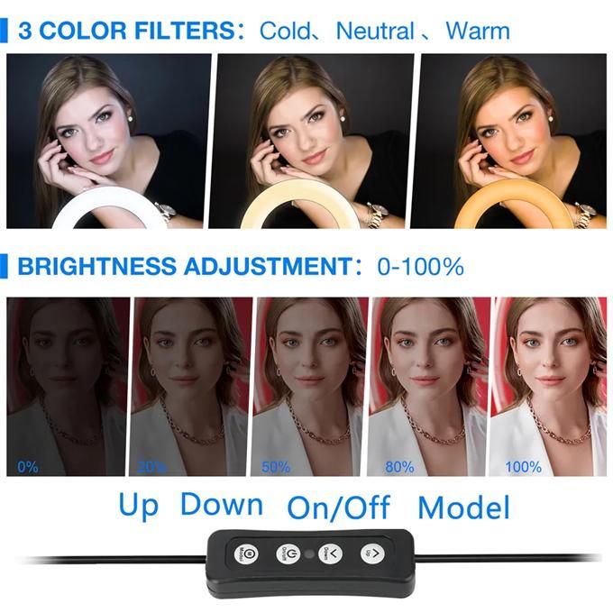 Features:- 1.10 inch dimmable ring light ring light has 3 color lighting modes: warm yellow, cool white, warm white. Each mode has 10 brightness levels to choose from, helping you whether you need extra light to eliminate shadows when applying makeup, taking photos, taking selfies, making videos, live streaming, etc.!