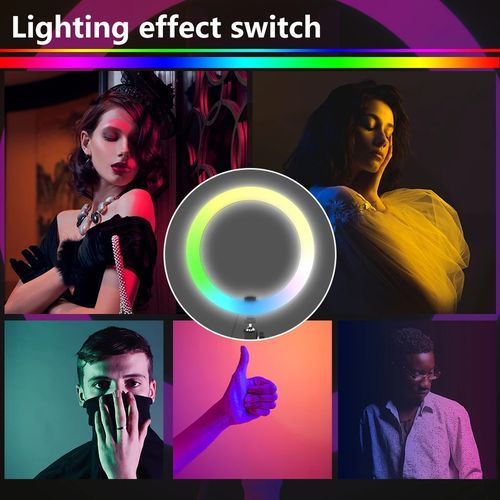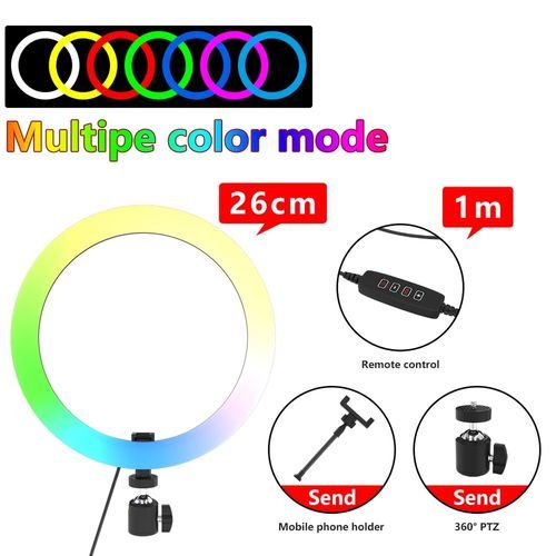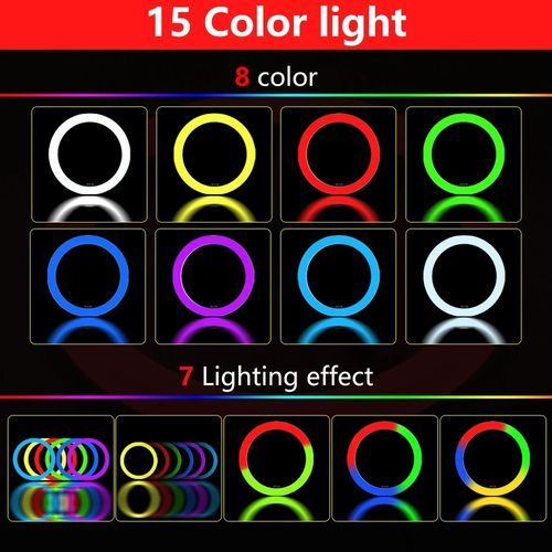 The color ring LED light with a diameter of 26 cm will ensure uniformity and softnessStudio light for portrait or subject photography, striping andlive streaming. She will become an indispensable assistant in the makeup artist's work,Stylists, hairdressers and other professionals in the beauty industry. With her you haveGet a great selfie!Advantage:The main advantages are no glare and uniform dispersionLight. Every expert will first notice the possibility of regulationColor temperature and color rendering index, which in turn makes it moreAttracted many highly qualified expertsAreas that require high-quality light. This product can not only be used inProfessional use, but also suitable for home useLightweight and compact.The kit includes a 2 m high tripod and a mobile phone holder. Security phoneBracket, choose the best angle, and enjoy the wonderful frame! goodsCertification. All lamps are of high quality, and every lamp before shipment is qualifiedPre-test.feature:Color RGB backlight with smooth brightness and color temperature adjustment.feature:Lamp diameter: 26 cm.Lamp power: 10 W.Light source: 140 LEDs + 35 RGBColor temperature: RGB and 3000-6000K.