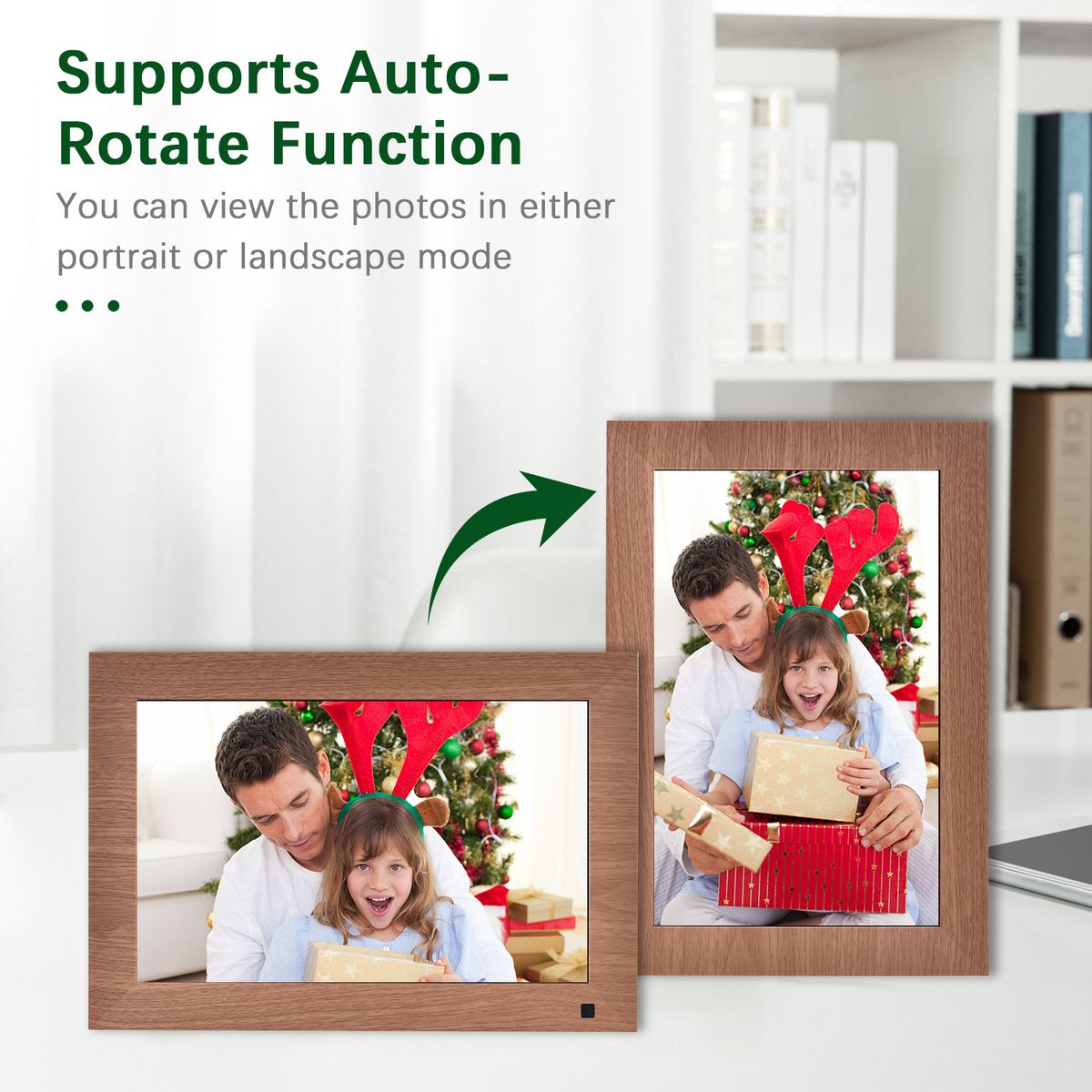 【Automatic Rotation & Motion Sensor】The digital photo frame can automatically rotate photo to adjust the direction. Comes with a detachable backside stand, which allows you to view the photos in either portrait or landscape mode. Built-in motion sensor to wake the digital photo frame when detecting people motion, very energy saving.