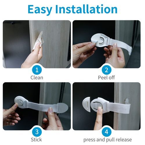 Safe & Durable Materials--Our baby proof cabinet locks are made of environmentally friendly high-quality ABS materials and strong nylon webbing. It can be firmly fixed on your furniture. And it has been certified by professional laboratories for safety testing. There are no toxic chemicals that affect the health and development of your young children.