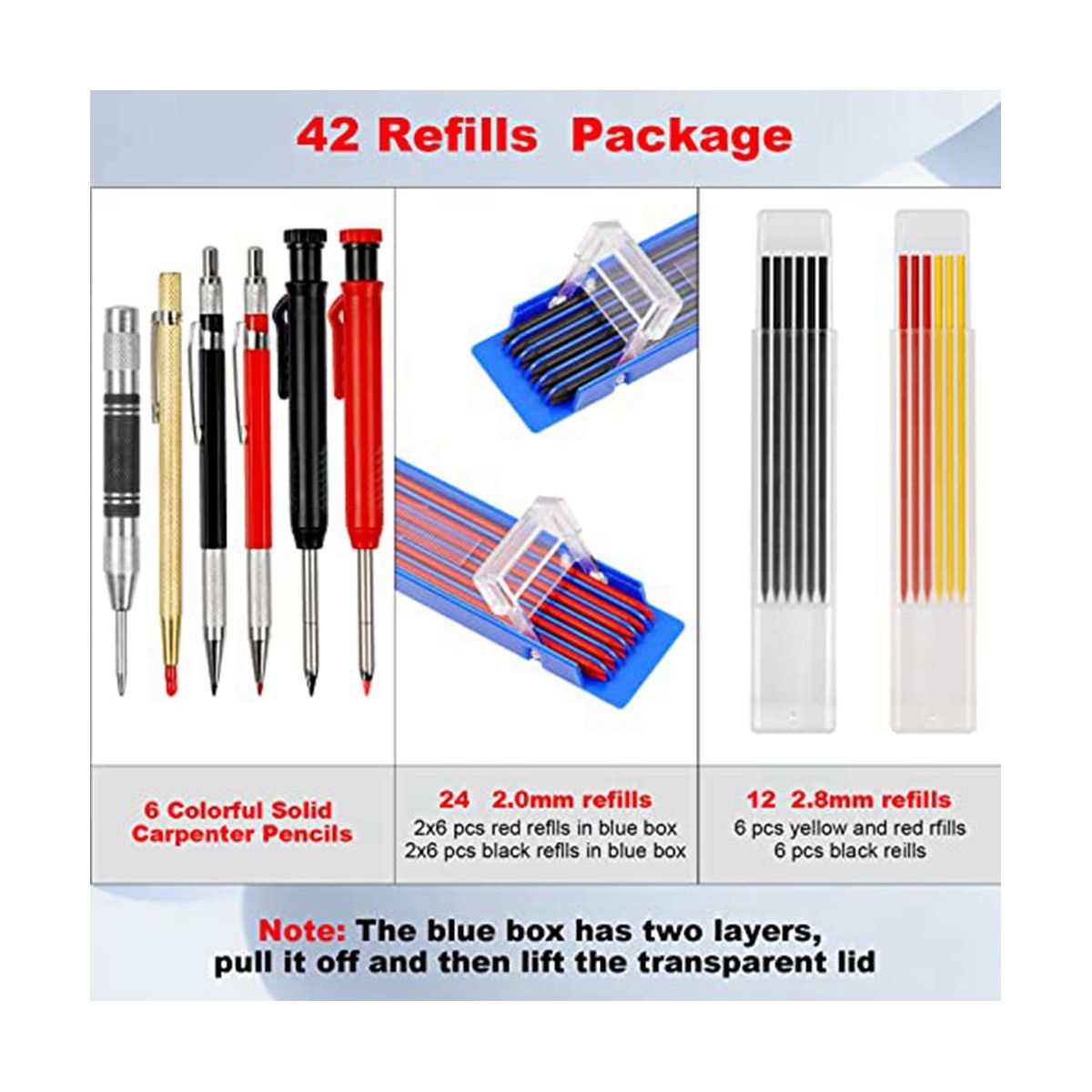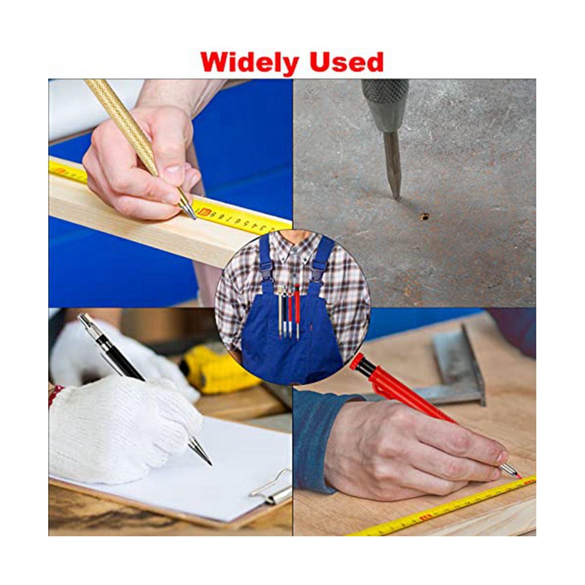 [Carpenter Marking Tools Set]: This marking kit include 2 pieces deep hole woodworking pencils, 2 pieces solid mechanical carpenter pencil with 36pcs marker refills, 1 piece automatic center punch tool and 1 piece carbide scribe tool; Multiple tools can meet your different marking needs in working.