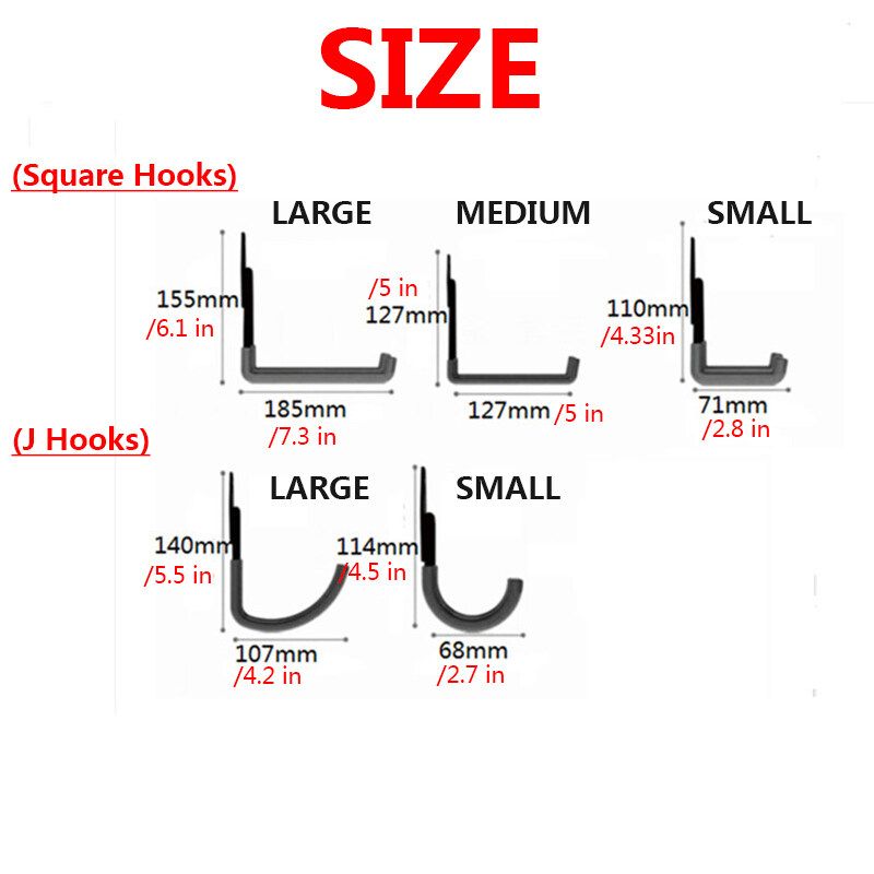 -We offer 5 varying sizes of garage hooks for varying usage: 2 large square hooks, 1 medium square hooks, 4 small square hooks, 1 large J hook and 2 small J hook.