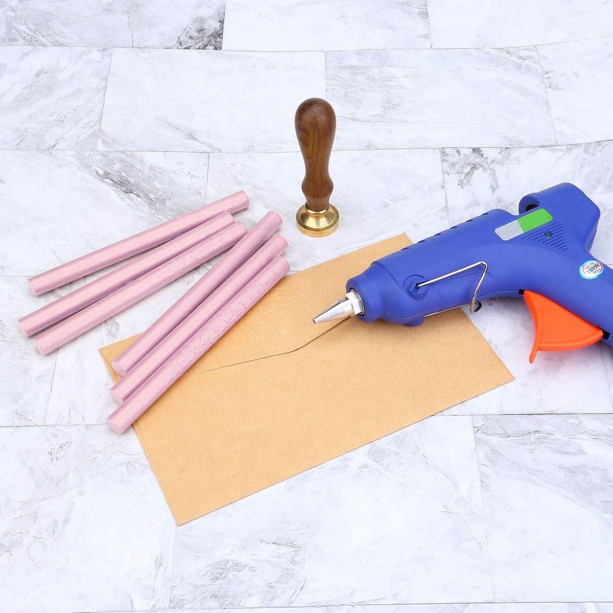 [EASY TO USE]This sealing wax sticks could melt without flame, use it with a low-temp large standard 0.44 inch glue gun. If you plan to seal dozens of envelops. To avoid the wax stuck to the stamp, you may chill your stamp with ice pack before stamping, it will be cool down quickly and the wax will not stick to your stamp.