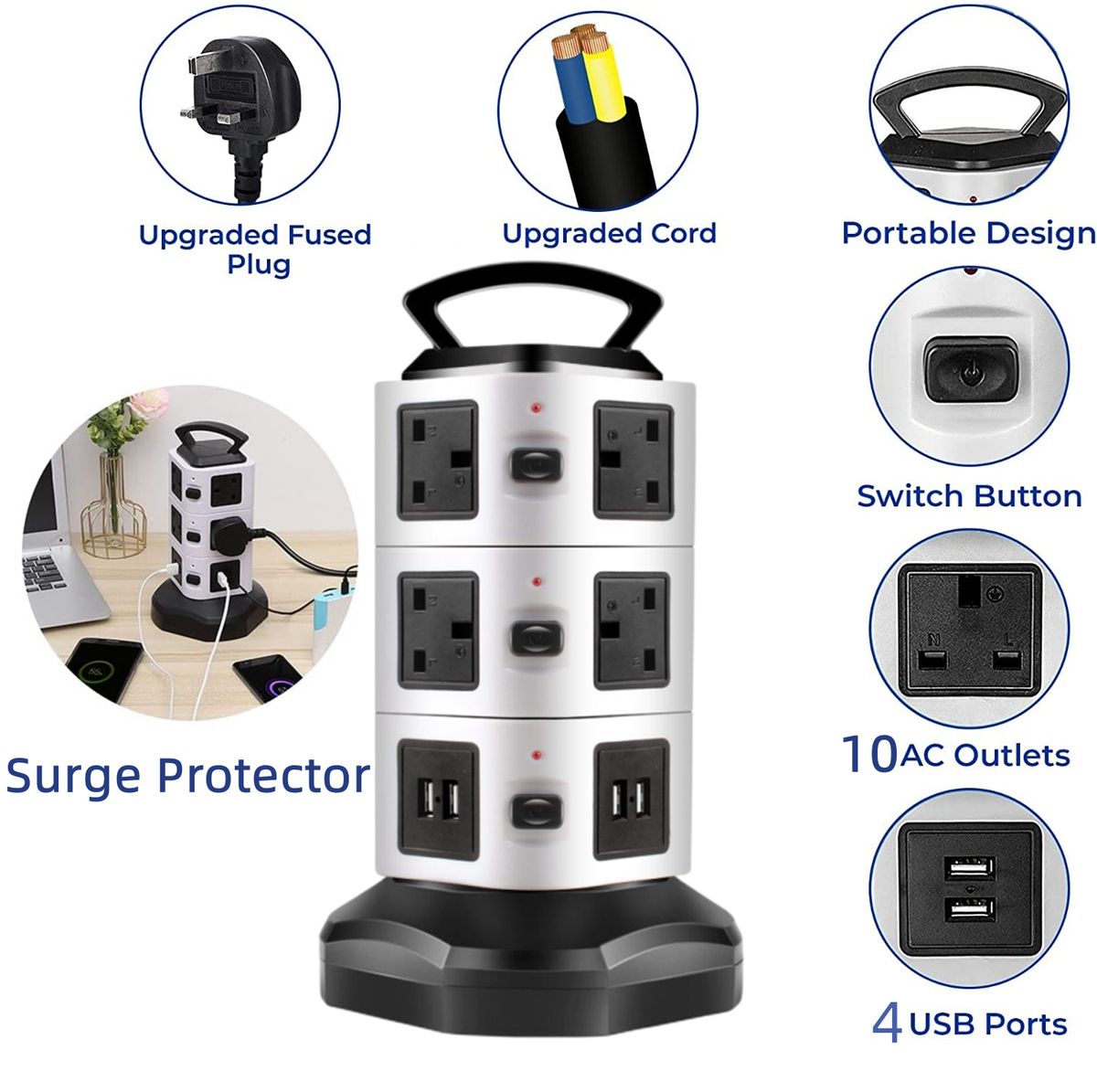 - The Extension Plug turns a single socket mains outlet into a 10-way socket extension with 4 USB charger, which is perfect for places without enough outlets. The Power Extension has a streamlined, modern design with a black finish. It blends seamlessly with your home appliances, computer equipment, and home electronic systems.