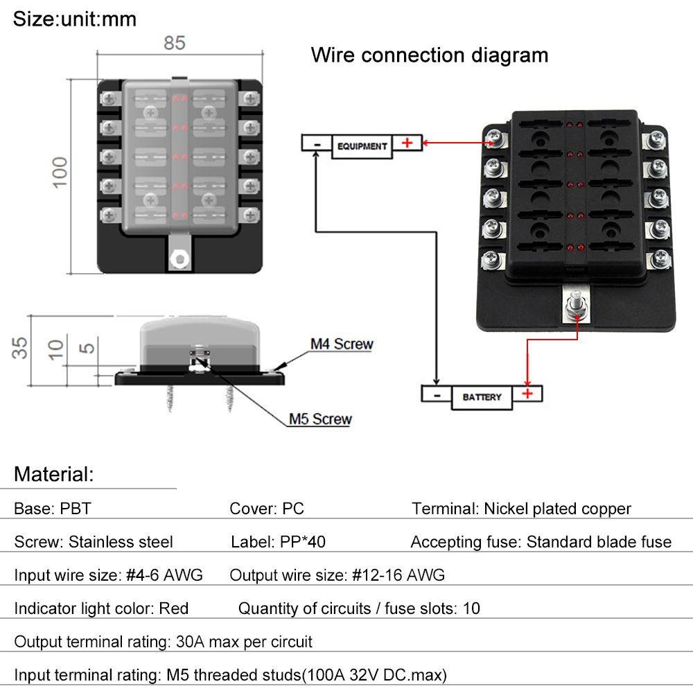 10 Way Blade Fuse Box with LED Indicator + 10Pcs Fuses + 10Pcs Terminals + 1Pcs decal