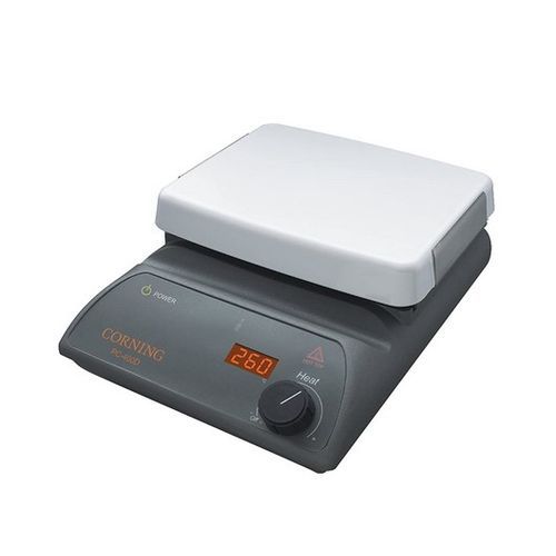 The Corning hotplate 6795-PC 600D has a digital LED temperature display in degrees C, a 10 x 10-inch glass-ceramic plate surface, a microprocessor-based temperature control unit, and a three-prong plug that works with a 100V/60Hz power source. This hotplate is used by researchers, professionals, and hobbyists to heat a variety of liquids and solutions in chemistry, food and beverage, biology, lab, and home applications.