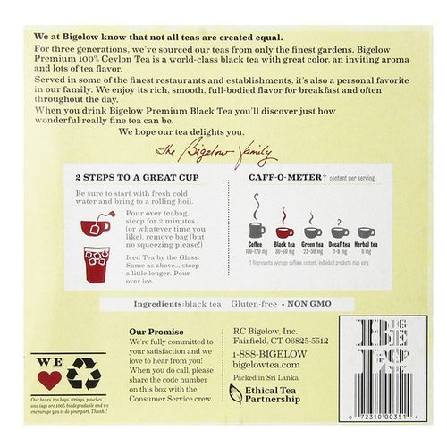 Bigelow Tea - A Premium Blend - 1 Box with 100 tea bags. Lots more tea flavor... That's what you can expect from a cup of Bigelow Premium Blend 100% Ceylon Tea. The Bigelow Family has selected teas from only the finest tea gardens where tea grows slowly and has plenty of time to develop full, rich flavor. Just one sip and you'll agree...lots more tea flavor! Premium Blend has the highest quality Orange Pekoe and Pekoe-Cut Black Tea. Orange Pekoe is not a flavor description. It is a term used to describe the size of the tea leaf. 1 Boxes of Premium Blend Tea. Box contains 100 tea bags.