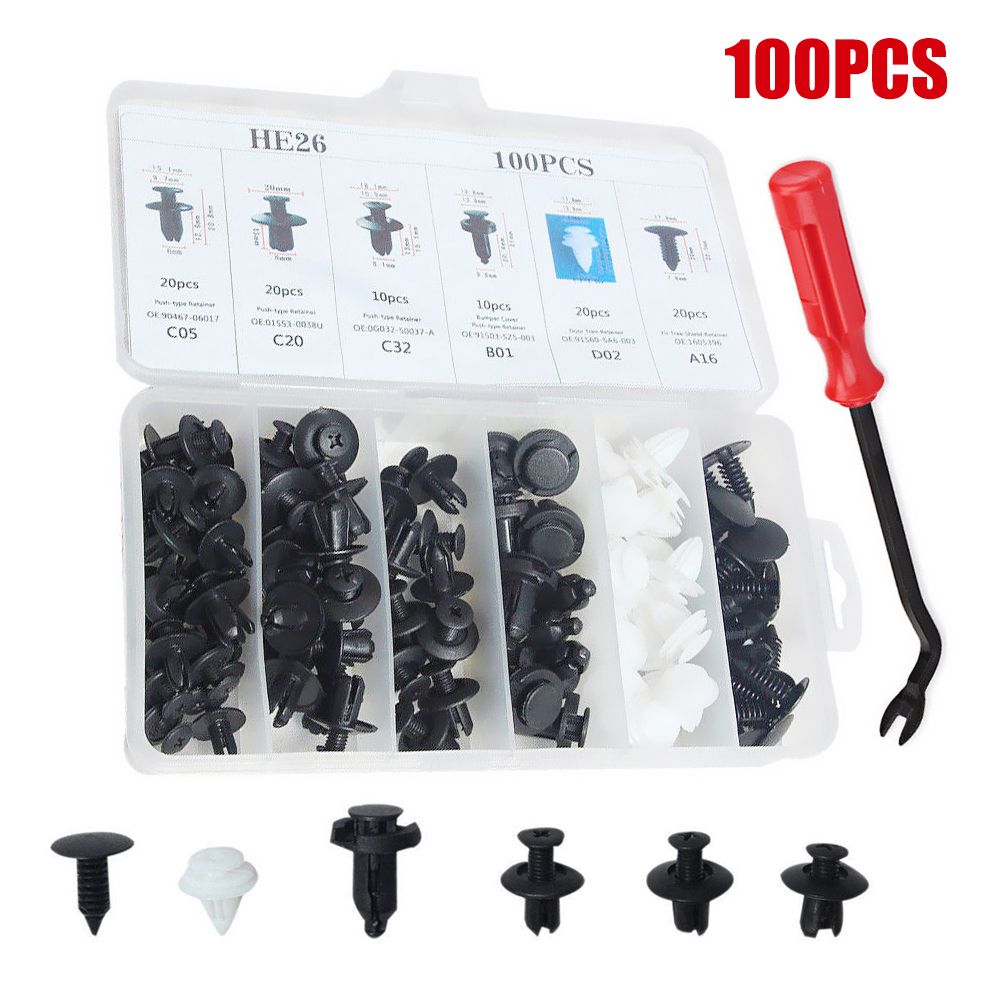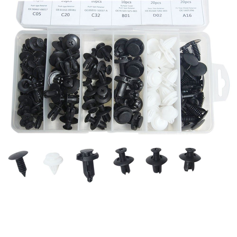 100pcs assorted moulding clip kit, including 6 types to meet your demands. All pins and rivets are packed in a storage box which designed with separated space for each specification tool, convenient to select and collect. Great car accessories, commonly used for fitting side skirts, bumpers, door trim, panel, retainer, fastener, etc.