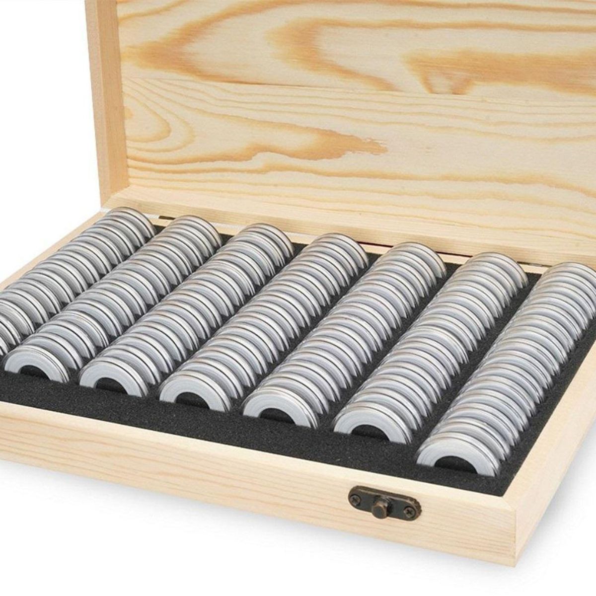Each set contains 100 pieces coin ( 30mm ) with 100 pieces 5 sizes foam gasket and wooden storage box . These round coin are made of plastic , high - transparent and anti - oxidation , durable for use . 5 in 1 foam gasket size fits for 18 / 21 / 25 / 27 / 30mm coin , you also can trim the gasket based on your coin 39 ; s size . Each round coin case has a crescent opening in the outside rim , very convenient to use . Clear coin organizers facilitate to coin storage , perfect gift for coin collectors to store and their favorite coins .
